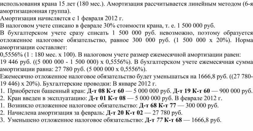 В январе 2012 г. ООО «Альфа» приобрело и ввело в эксплуатацию башенный подъемный кран стоимостью 5 000 000 руб. (без НДС). В бухгалтерском и налоговом учете срок полезного использования крана 15 лет (180 мес.). Амортизация рассчитывается линейным методом (6-я амортизационная группа).