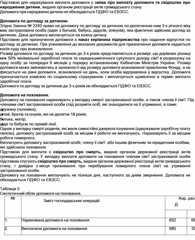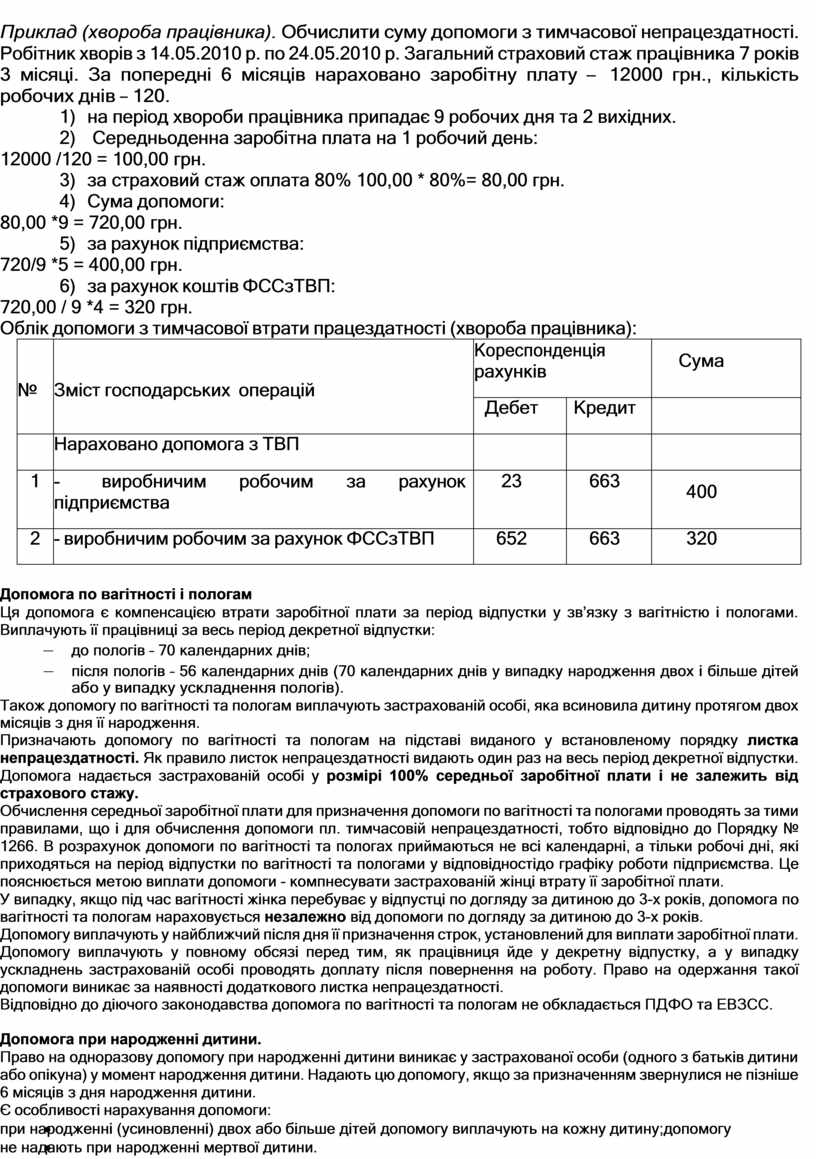 Згідно з ЗУ «Про загальнообов'язкове державне соціальне страхування у зв'язку з тимчасовою втратою працездатності та витратами, зумовленими похованням № 2240, 2001 р. зі змінами і доп. допомога з тимчасової непрацездатності надається застрахованій особі у формі матеріального забезпечення з повною або часткової компенсацією втрати заробітної плати у наступних випадках: