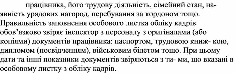 Особовий листок з облiку кадрiв є одним з основних доку- ментiв у особовiй справi. Вiн вiдображає автобiографiчнi данi про працiвника, його трудову дiяльнiсть, сiмейний стан, на- явнiсть урядових нагород, перебування за кордоном тощо. Правильнiсть заповнення особового листка облiку кадрiв обов’язково звiряє iнспектор з персоналу з оригiналами (або копiями) документiв працiвника: паспортом, трудовою книж- кою, дипломом (посвiдченням), вiйськовим бiлетом тощо. При цьому дати та iншi показники документiв звiряються з ти- ми, що вказанi в особовому листку з облiку кадрiв.