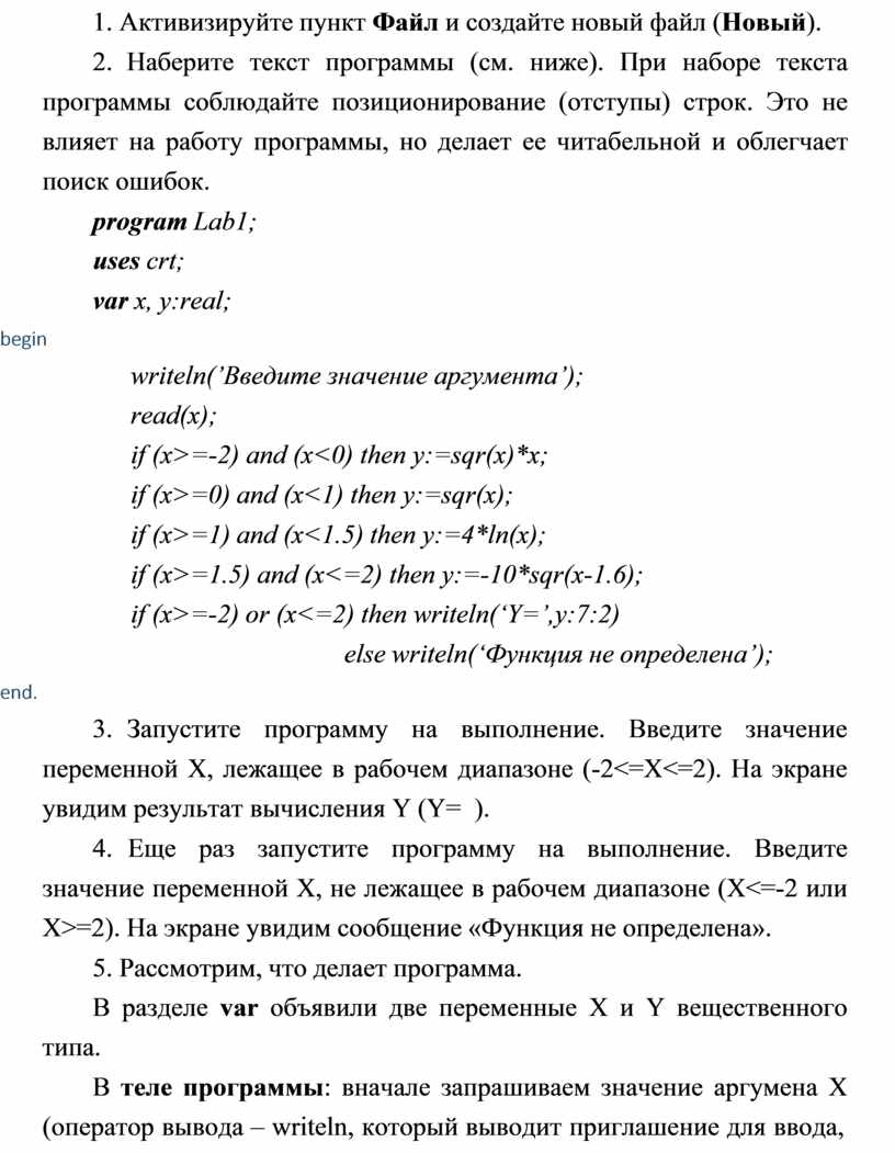 2. Наберите текст программы (см. ниже). При наборе текста программы соблюдайте позиционирование (отступы) строк. Это не влияет на работу программы, но делает ее читабельной и облегчает поиск ошибок.