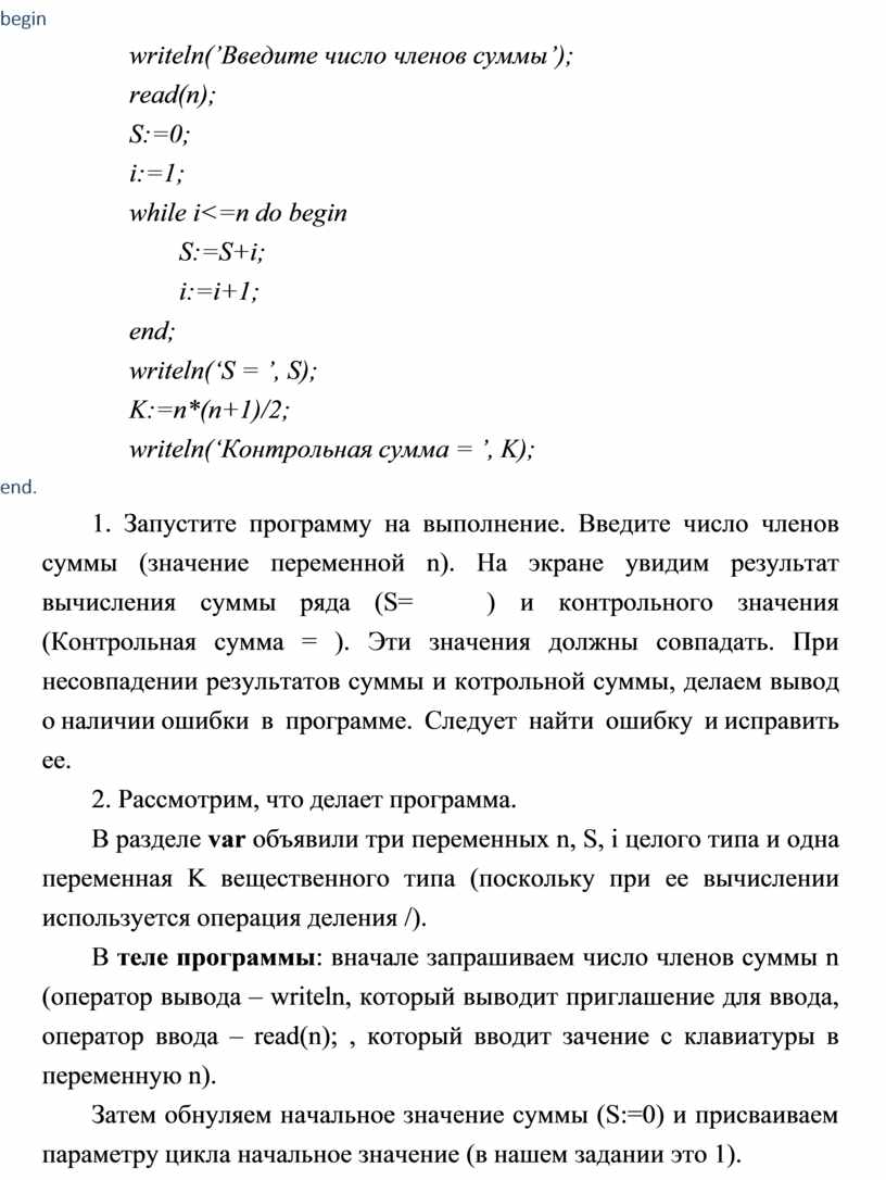 После оператора цикла в программе следует оператор вывода на экран вычисленной суммы (writeln(‘S = ’, S) ), вычисление котрольной суммы по заданной формуле (K:=n*(n+1)/2) и вывод ее на экран (writeln(‘Контрольная сумма = ’, K) ).