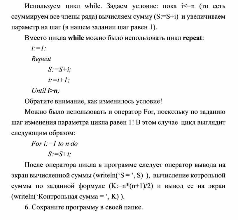 Используем цикл while. Задаем условие: пока i<=n (то есть ссуммируем все члены ряда) вычисляем сумму (S:=S+i) и увеличиваем параметр на шаг (в нашем задании шаг равен 1).