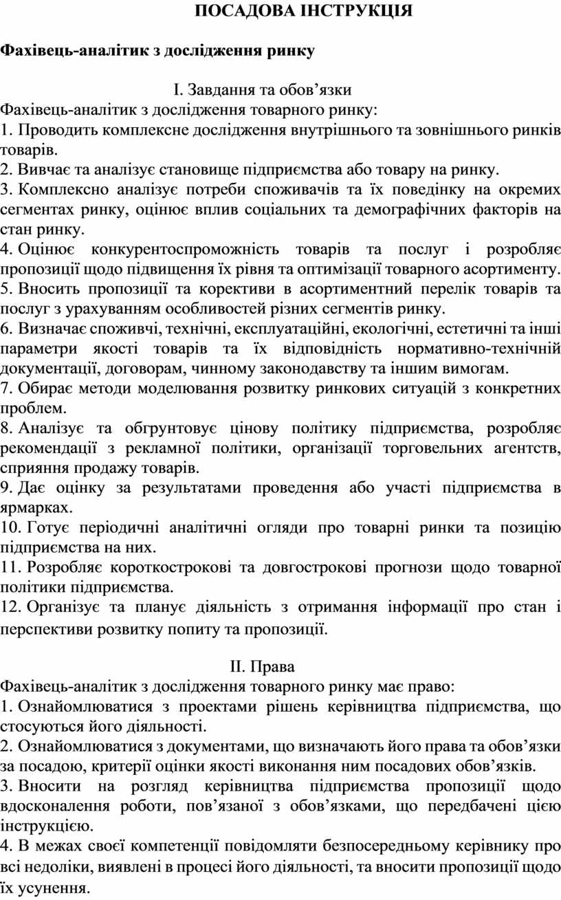 I. Завдання та обов’язки Фахівець-аналітик з дослідження товарного ринку: