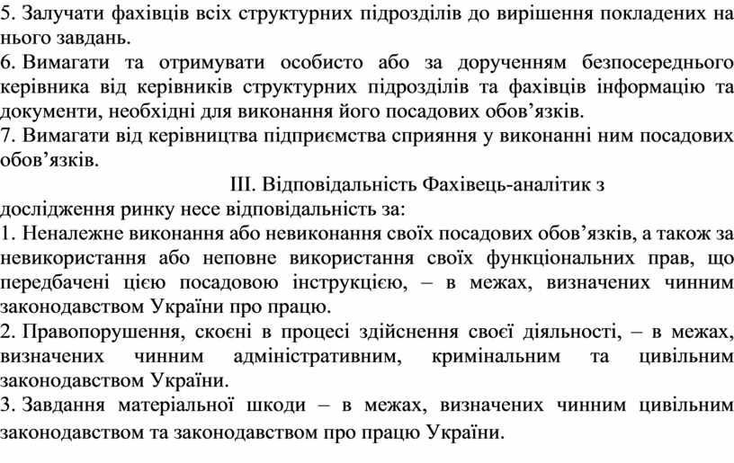 IІІ. Відповідальність Фахівець-аналітик з дослідження ринку несе відповідальність за:
