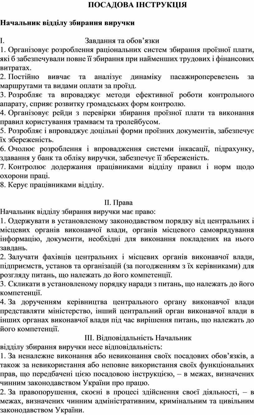 ІІІ. Відповідальність Начальник відділу збирання виручки несе відповідальність: