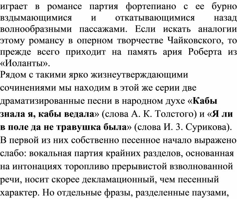 Рядом с такими ярко жизнеутверждающими сочинениями мы находим в этой же серии две драматизированные песни в народном духе «Кабы знала я, кабы ведала» (слова А. К. Толстого) и «Я ли в поле да не травушка была» (слова И. 3. Сурикова). В первой из них собственно песенное начало выражено слабо: вокальная партия крайних разделов, основанная на интонациях торопливо прерывистой взволнованной речи, носит скорее декламационный, чем песенный характер. Но отдельные фразы, разделенные паузами, образуют в своей последовательности восходящий ряд свободных секвенций, завершающийся более протяженной фразой с возвращением к исходному высотному уровню, что способствует мелодическому объединению всего первого построения. Контрастный средний раздел в вальсовом ритме близок по характеру к городской лирической песне-романсу варламовско-гурилевского типа. Собственно же народный колорит ярче всего выражен в окаймляющем романс фортепианном ритурнеле в духе печального свирельного наигрыша.