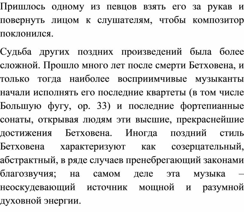 Судьба других поздних произведений была более сложной. Прошло много лет после смерти Бетховена, и только тогда наиболее восприимчивые музыканты начали исполнять его последние квартеты (в том числе Большую фугу, ор. 33) и последние фортепианные сонаты, открывая людям эти высшие, прекраснейшие достижения Бетховена. Иногда поздний стиль Бетховена характеризуют как созерцательный, абстрактный, в ряде случаев пренебрегающий законами благозвучия; на самом деле эта музыка – неоскудевающий источник мощной и разумной духовной энергии.