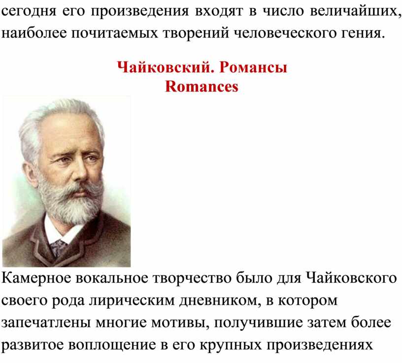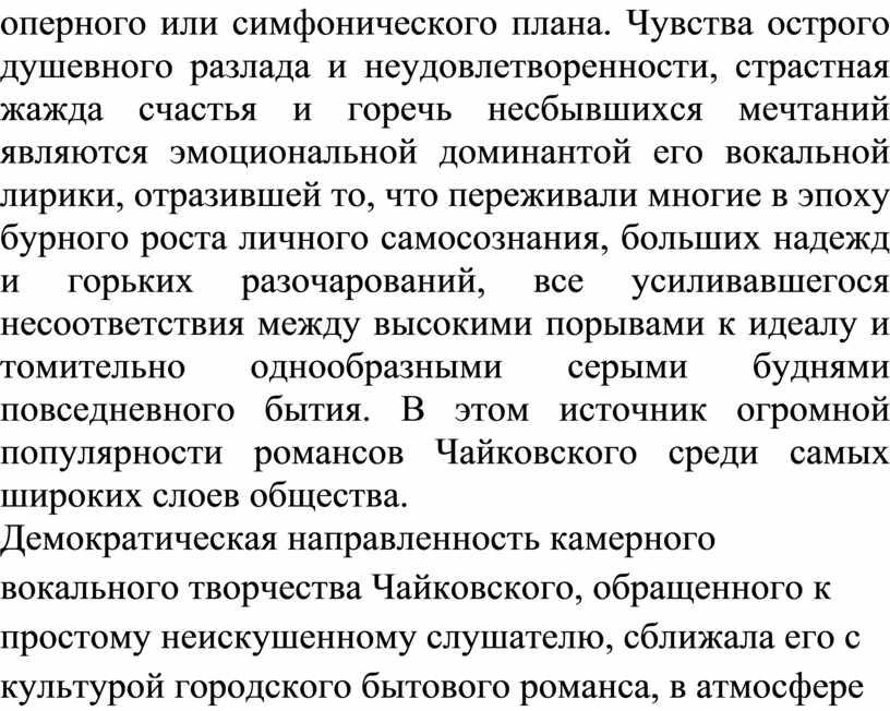 Камерное вокальное творчество было для Чайковского своего рода лирическим дневником, в котором запечатлены многие мотивы, получившие затем более развитое воплощение в его крупных произведениях оперного или симфонического плана. Чувства острого душевного разлада и неудовлетворенности, страстная жажда счастья и горечь несбывшихся мечтаний являются эмоциональной доминантой его вокальной лирики, отразившей то, что переживали многие в эпоху бурного роста личного самосознания, больших надежд и горьких разочарований, все усиливавшегося несоответствия между высокими порывами к идеалу и томительно однообразными серыми буднями повседневного бытия. В этом источник огромной популярности романсов Чайковского среди самых широких слоев общества.