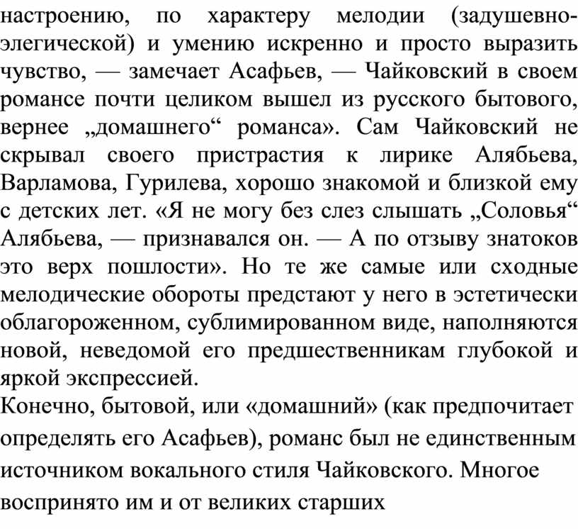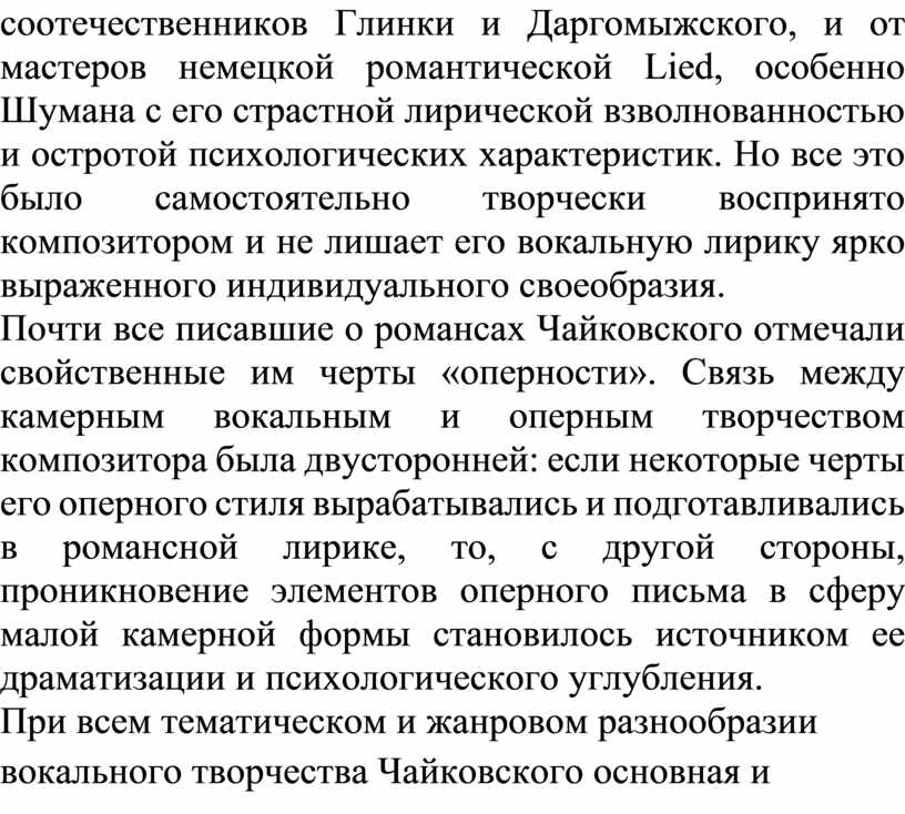 Конечно, бытовой, или «домашний» (как предпочитает определять его Асафьев), романс был не единственным источником вокального стиля Чайковского. Многое воспринято им и от великих старших соотечественников Глинки и Даргомыжского, и от мастеров немецкой романтической Lied, особенно Шумана с его страстной лирической взволнованностью и остротой психологических характеристик. Но все это было самостоятельно творчески воспринято композитором и не лишает его вокальную лирику ярко выраженного индивидуального своеобразия.