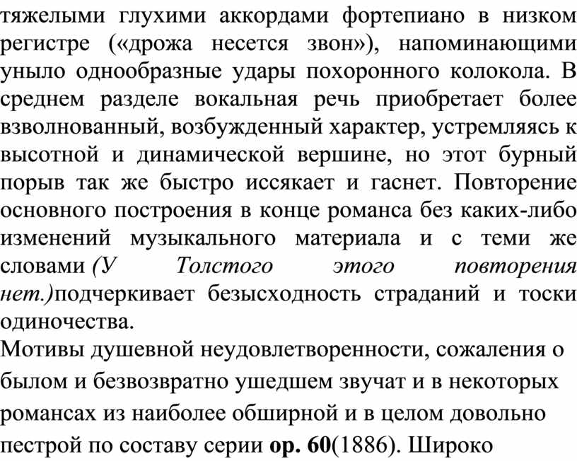 Мотивы душевной неудовлетворенности, сожаления о былом и безвозвратно ушедшем звучат и в некоторых романсах из наиболее обширной и в целом довольно пестрой по составу серии ор. 60(1886). Широко популярными стали такие из них, как «Ночи безумные» на слова Апухтина и «Ночь» (Е. М. Орлова обращает внимание на образ ночи как центральный, доминирующий образ всей этой серии, включающей двенадцать романсов на стихи разных поэтов.) на стихи Полонского, до некоторой степени родственные по своему образному строю и средствам музыкальной выразительности. Содержанием их являются печальные одинокие размышления среди ночной тиши и безмолвия, не приносящих успокоения больной страдающей душе.
