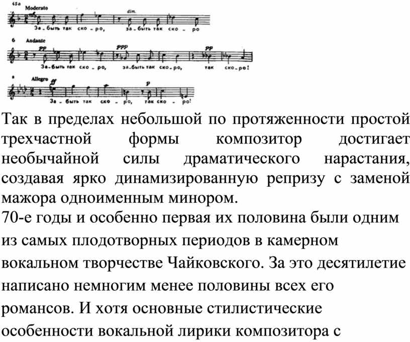 К охарактеризованной серии близок по характеру и отдельно изданный в 1870 году романс «Забыть так скоро» (По предположению Н. В. Туманиной, он был написан в одно время с группой из шести романсов ор. 6.) на стихи А. Н. Апухтина. Слова, вынесенные в его название, служат в тексте стихотворения рефреном, завершающим отдельные строфы. Чайковский интонирует их каждый раз по-разному. В первых двух строфах они звучат мягко, задумчиво, в третьей строфе (составляющей середину трехчастной формы) интервал увеличенной кварты и скорбная малосекундовая нисходящая интонация придают им большую выразительную остроту. Но особенно разительный драматический контраст вносит окончание последней (четвертой) строфы, где благодаря интервалу уменьшенной септимы с дальнейшим ниспаданием на малую сексту и перенесению в высокий напряженный регистр со сменой динамических оттенков ff и p, эти слова воспринимаются как возглас отчаяния.