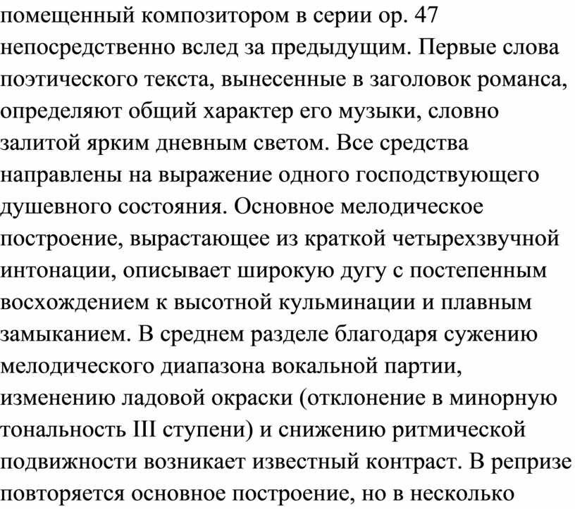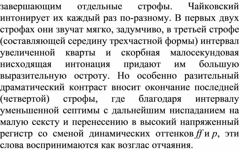 Подобный оборот неоднократно применяется Чайковским как интонация скорбного раздумья или нежного настойчивого уверения («Примиренье», «Страшная минута»). Замечательно тесное взаимодействие вокальной и фортепианной партий, между которыми возникает выразительный диалог, ведущийся на протяжении всего романса.