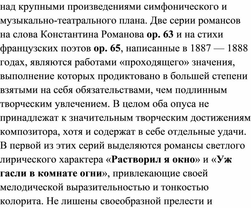 В конце 80 — начале 90-х годов интерес к камерным вокальным жанрам у Чайковского заметно снижается, что можно отчасти объяснить напряженной работой над крупными произведениями симфонического и музыкально-театрального плана. Две серии романсов на слова Константина Романова ор. 63 и на стихи французских поэтов ор. 65, написанные в 1887 — 1888 годах, являются работами «проходящего» значения, выполнение которых продиктовано в большей степени взятыми на себя обязательствами, чем подлинным творческим увлечением. В целом оба опуса не принадлежат к значительным творческим достижениям композитора, хотя и содержат в себе отдельные удачи. В первой из этих серий выделяются романсы светлого лирического характера «Растворил я окно» и «Уж гасли в комнате огни», привлекающие своей мелодической выразительностью и тонкостью колорита. Не лишены своеобразной прелести и некоторые из романсов французского цикла, в целом простые и непритязательные по изложению. К бесспорным их достоинствам относится безупречность музыкальной декламации французского текста.