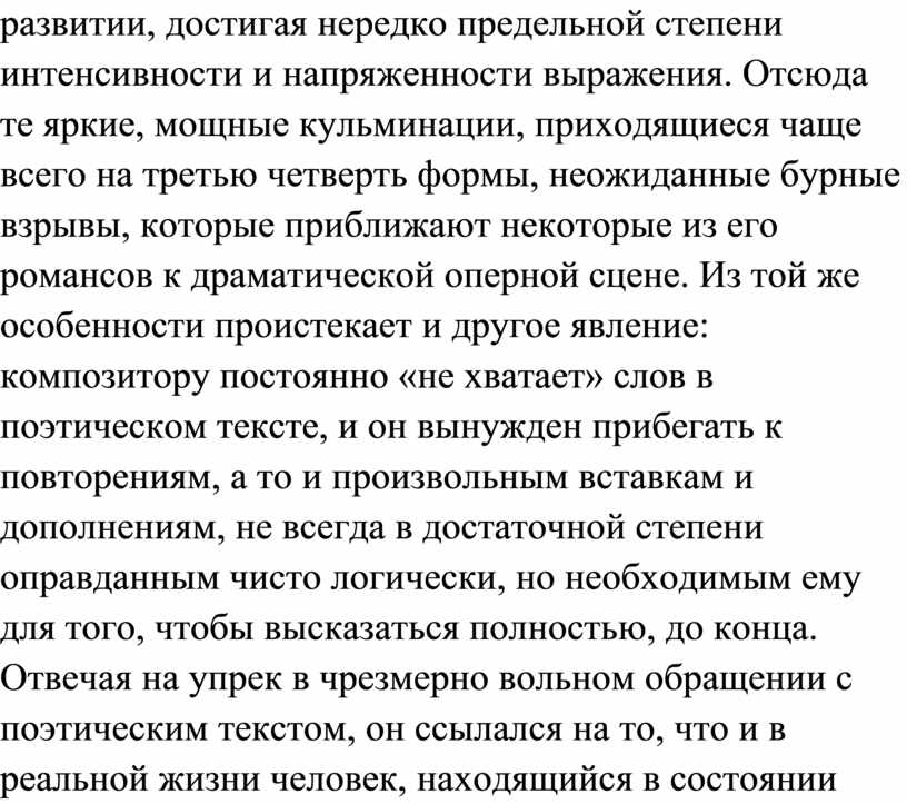 При этом каждое душевное состояние, каждое переживание Чайковский передает в динамике и развитии, достигая нередко предельной степени интенсивности и напряженности выражения. Отсюда те яркие, мощные кульминации, приходящиеся чаще всего на третью четверть формы, неожиданные бурные взрывы, которые приближают некоторые из его романсов к драматической оперной сцене. Из той же особенности проистекает и другое явление: композитору постоянно «не хватает» слов в поэтическом тексте, и он вынужден прибегать к повторениям, а то и произвольным вставкам и дополнениям, не всегда в достаточной степени оправданным чисто логически, но необходимым ему для того, чтобы высказаться полностью, до конца. Отвечая на упрек в чрезмерно вольном обращении с поэтическим текстом, он ссылался на то, что и в реальной жизни человек, находящийся в состоянии сильного душевного возбуждения, часто повторяет по нескольку раз одни и те же слова. «Но даже если бы в действительной жизни ничего подобного никогда не случалось, — прибавляет Чайковский, — то я нисколько бы не затруднился нагло отступать от реальной истины в пользу истины художественной».