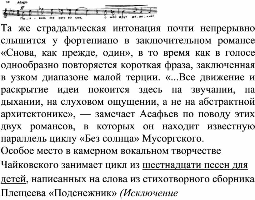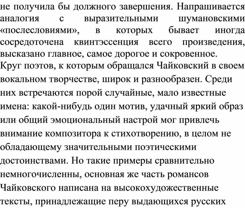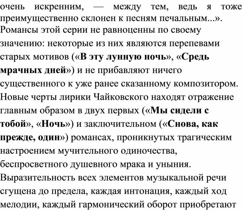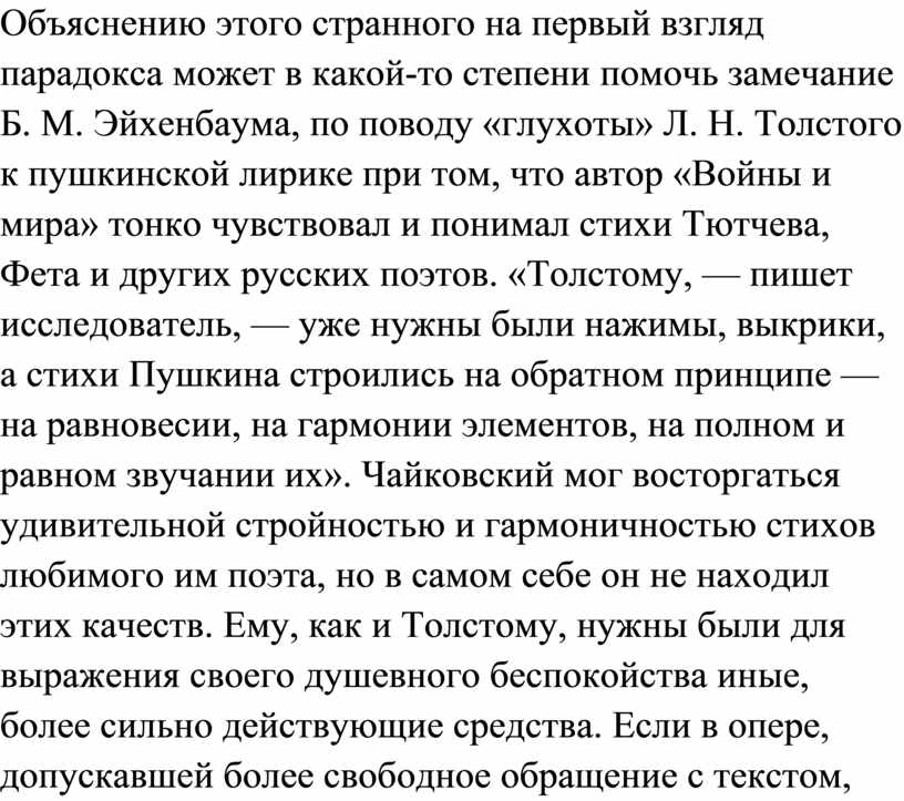 Объяснению этого странного на первый взгляд парадокса может в какой-то степени помочь замечание Б. М. Эйхенбаума, по поводу «глухоты» Л. Н. Толстого к пушкинской лирике при том, что автор «Войны и мира» тонко чувствовал и понимал стихи Тютчева, Фета и других русских поэтов. «Толстому, — пишет исследователь, — уже нужны были нажимы, выкрики, а стихи Пушкина строились на обратном принципе — на равновесии, на гармонии элементов, на полном и равном звучании их». Чайковский мог восторгаться удивительной стройностью и гармоничностью стихов любимого им поэта, но в самом себе он не находил этих качеств. Ему, как и Толстому, нужны были для выражения своего душевного беспокойства иные, более сильно действующие средства. Если в опере, допускавшей более свободное обращение с текстом, эта «психологическая несовместимость» не ощущается столь явно, то в романсе, где каждая деталь, каждый мелкий штрих несут определенную выразительную нагрузку, преодолеть ее Чайковскому не удавалось.