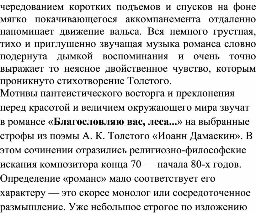 Мотивы пантеистического восторга и преклонения перед красотой и величием окружающего мира звучат в романсе «Благословляю вас, леса...» на выбранные строфы из поэмы А. К. Толстого «Иоанн Дамаскин». В этом сочинении отразились религиозно-философские искания композитора конца 70 — начала 80-х годов. Определение «романс» мало соответствует его характеру — это скорее монолог или сосредоточенное размышление. Уже небольшое строгое по изложению фортепианное вступление хорального типа с хроматической цепью задержаний приготавливает слушателя к чему-то серьезному и значительному. Простая и ясная декламационная мелодия вокальной партии, прерываемая частыми паузами и остановками движения, передает состояние человека, погруженного в глубокие думы. Постепенно нарастающее светлое чувство достигает ликующей силы в заключительной (четвертой) строфе, где высказана главная мысль произведения: «О, если б мог в свои объятья я вас, враги, друзья и братья, и всю природу заключить!» Эта яркая кульминация выделена с помощью целой суммы мелодических (начало с «вершины-источника»), гармонических (отклонение в тональность VII низкой ступени ми-бемоль мажора), динамических (нарастание от f до fff) и агогических (ускорение темпа) средств.