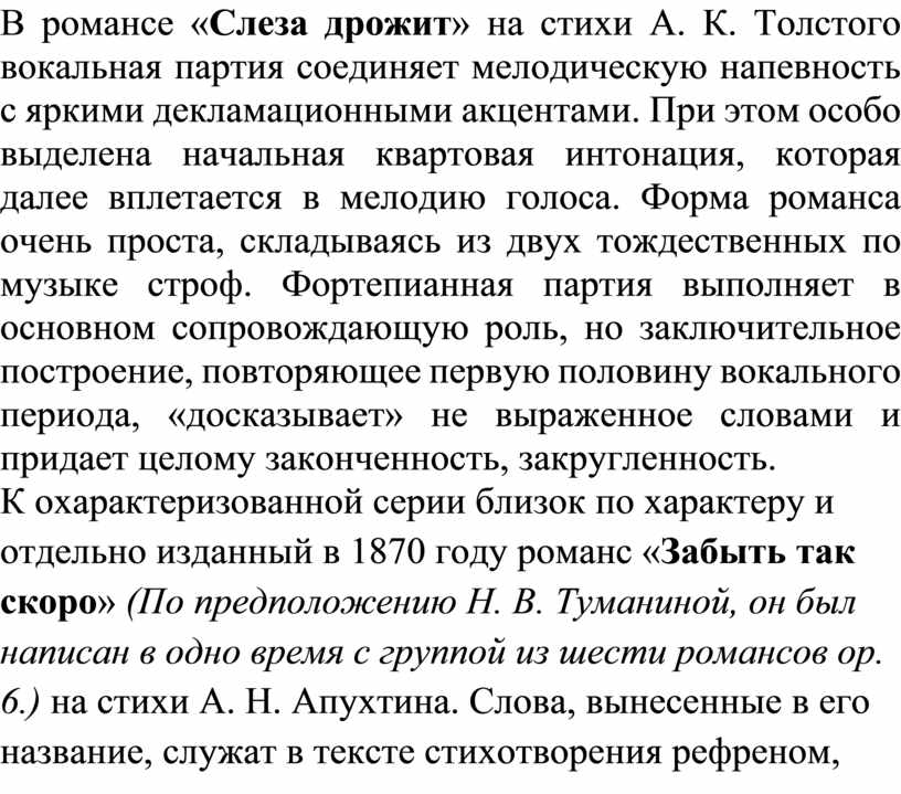 В романсе «Слеза дрожит» на стихи А. К. Толстого вокальная партия соединяет мелодическую напевность с яркими декламационными акцентами. При этом особо выделена начальная квартовая интонация, которая далее вплетается в мелодию голоса. Форма романса очень проста, складываясь из двух тождественных по музыке строф. Фортепианная партия выполняет в основном сопровождающую роль, но заключительное построение, повторяющее первую половину вокального периода, «досказывает» не выраженное словами и придает целому законченность, закругленность.
