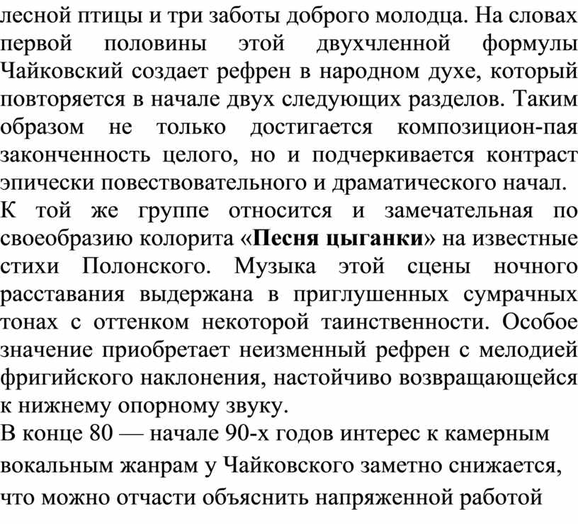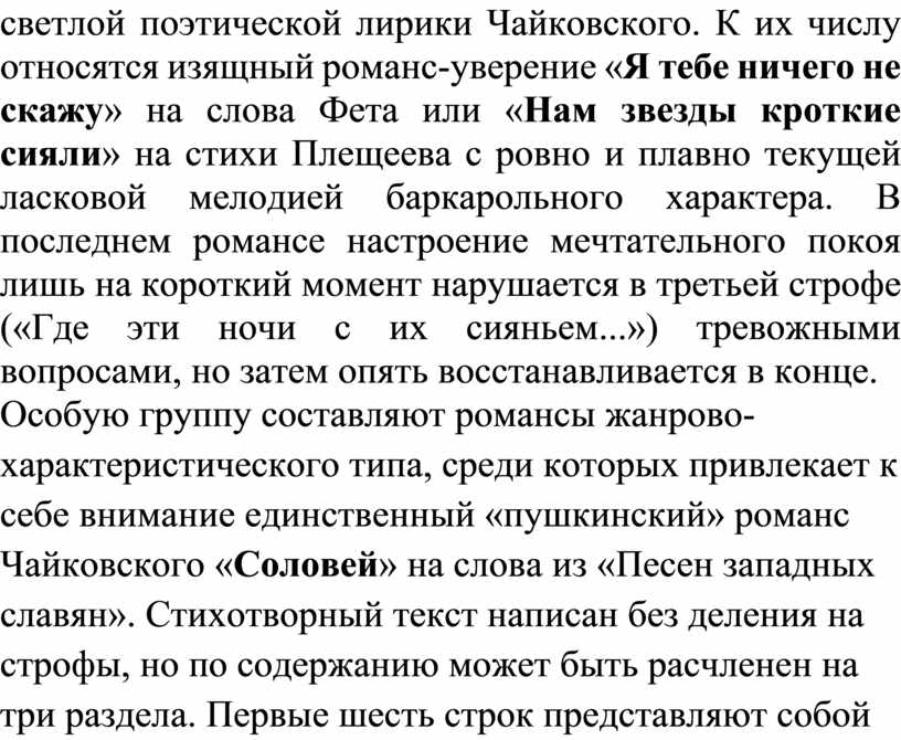 Особую группу составляют романсы жанрово-характеристического типа, среди которых привлекает к себе внимание единственный «пушкинский» романс Чайковского «Соловей» на слова из «Песен западных славян». Стихотворный текст написан без деления на строфы, но по содержанию может быть расчленен на три раздела. Первые шесть строк представляют собой поэтический зачин, основанный на фольклорном приеме психологического параллелизма: три песни лесной птицы и три заботы доброго молодца. На словах первой половины этой двухчленной формулы Чайковский создает рефрен в народном духе, который повторяется в начале двух следующих разделов. Таким образом не только достигается композицион-пая законченность целого, но и подчеркивается контраст эпически повествовательного и драматического начал.