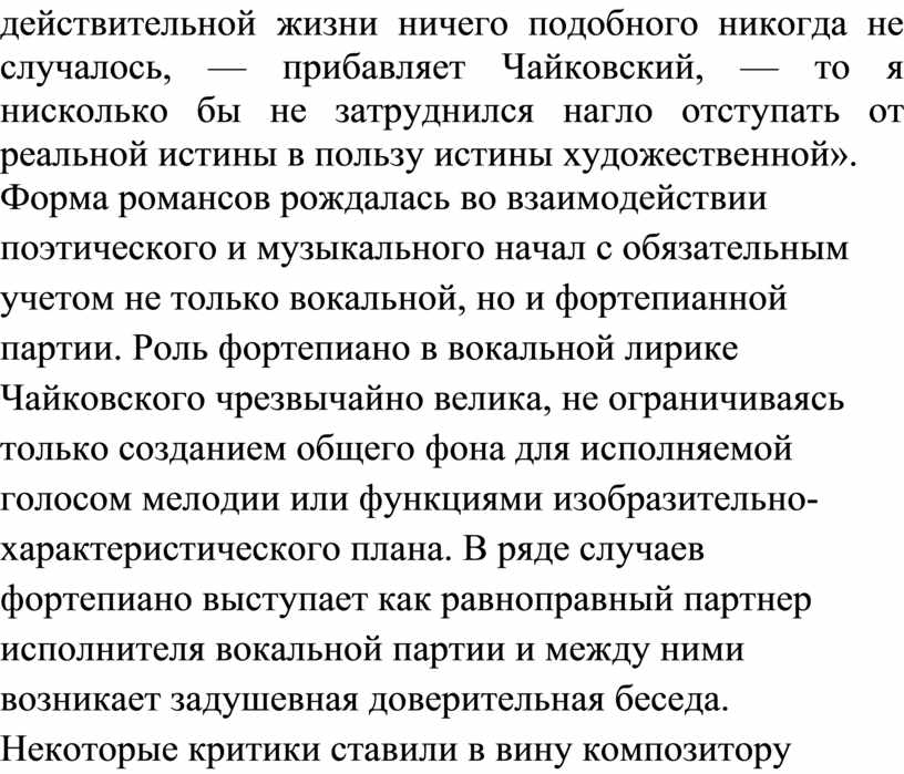 Форма романсов рождалась во взаимодействии поэтического и музыкального начал с обязательным учетом не только вокальной, но и фортепианной партии. Роль фортепиано в вокальной лирике Чайковского чрезвычайно велика, не ограничиваясь только созданием общего фона для исполняемой голосом мелодии или функциями изобразительно-характеристического плана. В ряде случаев фортепиано выступает как равноправный партнер исполнителя вокальной партии и между ними возникает задушевная доверительная беседа. Некоторые критики ставили в вину композитору пространные фортепианные заключения его романсов, но без них мысль осталась бы недосказанной и форма не получила бы должного завершения. Напрашивается аналогия с выразительными шумановскими «послесловиями», в которых бывает иногда сосредоточена квинтэссенция всего произведения, высказано главное, самое дорогое и сокровенное.