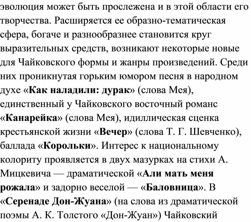70-е годы и особенно первая их половина были одним из самых плодотворных периодов в камерном вокальном творчестве Чайковского. За это десятилетие написано немногим менее половины всех его романсов. И хотя основные стилистические особенности вокальной лирики композитора с достаточной ясностью выявляются уже в рассмотренной группе романсов, определенная эволюция может быть прослежена и в этой области его творчества. Расширяется ее образно-тематическая сфера, богаче и разнообразнее становится круг выразительных средств, возникают некоторые новые для Чайковского формы и жанры произведений. Среди них проникнутая горьким юмором песня в народном духе «Как наладили: дурак» (слова Мея), единственный у Чайковского восточный романс «Канарейка» (слова Мея), идиллическая сценка крестьянской жизни «Вечер» (слова Т. Г. Шевченко), баллада «Корольки». Интерес к национальному колориту проявляется в двух мазурках на стихи А. Мицкевича — драматической «Али мать меня рожала» и задорно веселой — «Баловница». В «Серенаде Дон-Жуана» (на слова из драматической поэмы А. К. Толстого «Дон-Жуан») Чайковский обращается к излюбленной русскими поэтами и композиторами первой половины XIX века испанской теме, но не пользуется традиционной формой болеро, следуя в большей мере, может быть, итальянским, нежели испанским образцам. В романсе сохранена двухстрофная песенная структура поэтического оригинала с постоянным припевом («От лунного света»), а повторяющийся бравурный ритурнель дополняет характеристику дерзкого, но рыцарственно благородного героя.