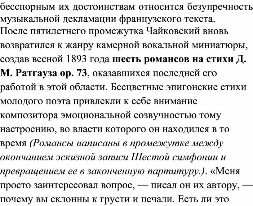 После пятилетнего промежутка Чайковский вновь возвратился к жанру камерной вокальной миниатюры, создав весной 1893 года шесть романсов на стихи Д. М. Ратгауза ор. 73, оказавшихся последней его работой в этой области. Бесцветные эпигонские стихи молодого поэта привлекли к себе внимание композитора эмоциональной созвучностью тому настроению, во власти которого он находился в то время (Романсы написаны в промежутке между окончанием эскизной записи Шестой симфонии и превращением ее в законченную партитуру.). «Меня просто заинтересовал вопрос, — писал он их автору, — почему вы склонны к грусти и печали. Есть ли это следствие темперамента или каких-нибудь особенных причин?.. Я имею претензию в музыке своей быть очень искренним, — между тем, ведь я тоже преимущественно склонен к песням печальным...».