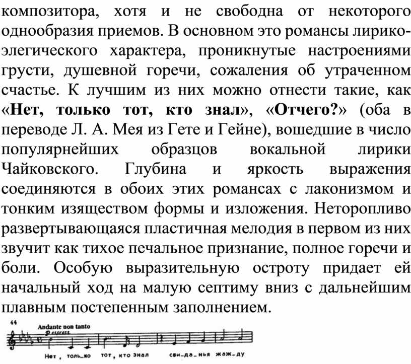 Первая серия романсов Чайковского, изданная в 1869 году (Три ранних его романса, не публиковавшихся при жизни композитора, — «Мой ангел, мой гений, мой друг» на слова А. А. Фета, «Песня Земфиры» из «Цыган» Пушкина и «Mezza notte» («Полночь») на анонимный итальянский текст — еще незрелы и не содержат каких-либо характерных индивидуальных черт.), свидетельствует об уже достаточно определившейся творческой индивидуальности композитора, хотя и не свободна от некоторого однообразия приемов. В основном это романсы лирико-элегического характера, проникнутые настроениями грусти, душевной горечи, сожаления об утраченном счастье. К лучшим из них можно отнести такие, как «Нет, только тот, кто знал», «Отчего?» (оба в переводе Л. А. Мея из Гете и Гейне), вошедшие в число популярнейших образцов вокальной лирики Чайковского. Глубина и яркость выражения соединяются в обоих этих романсах с лаконизмом и тонким изяществом формы и изложения. Неторопливо развертывающаяся пластичная мелодия в первом из них звучит как тихое печальное признание, полное горечи и боли. Особую выразительную остроту придает ей начальный ход на малую септиму вниз с дальнейшим плавным постепенным заполнением.