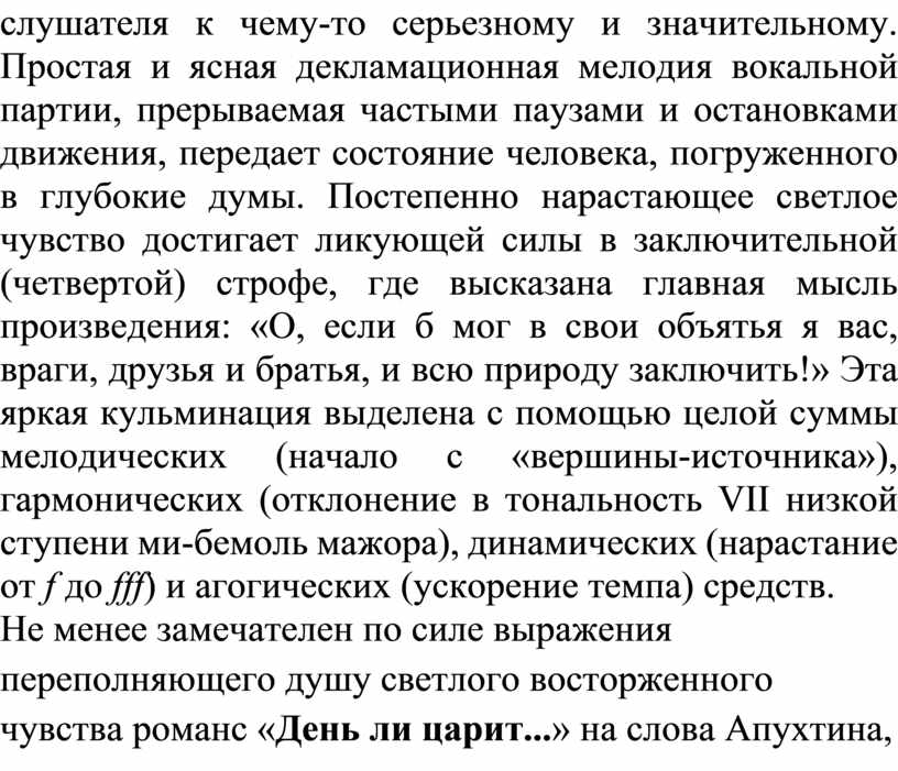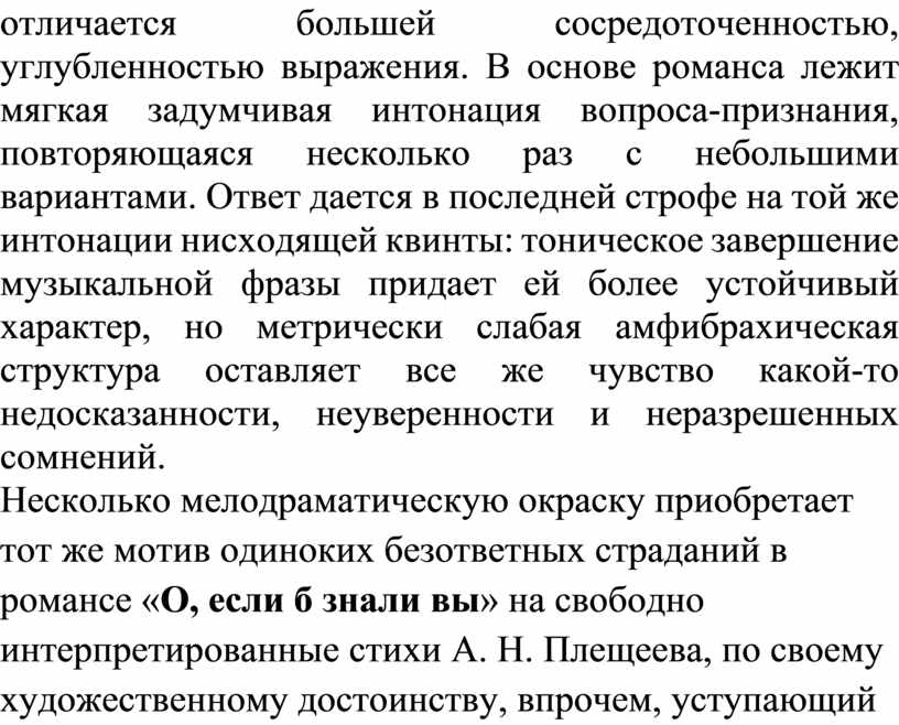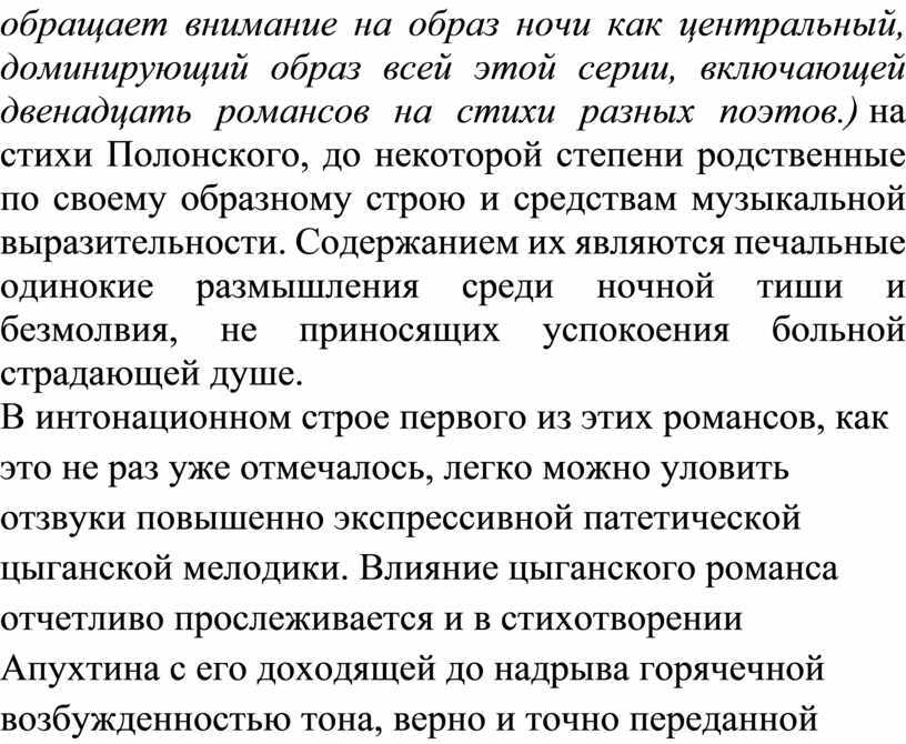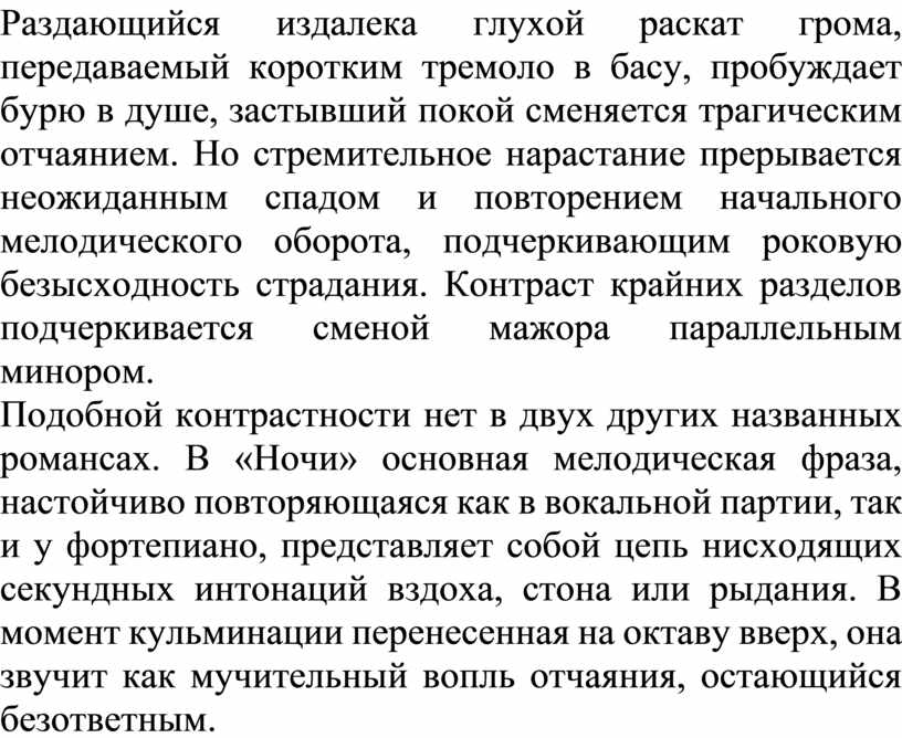 Подобной контрастности нет в двух других названных романсах. В «Ночи» основная мелодическая фраза, настойчиво повторяющаяся как в вокальной партии, так и у фортепиано, представляет собой цепь нисходящих секундных интонаций вздоха, стона или рыдания. В момент кульминации перенесенная на октаву вверх, она звучит как мучительный вопль отчаяния, остающийся безответным.