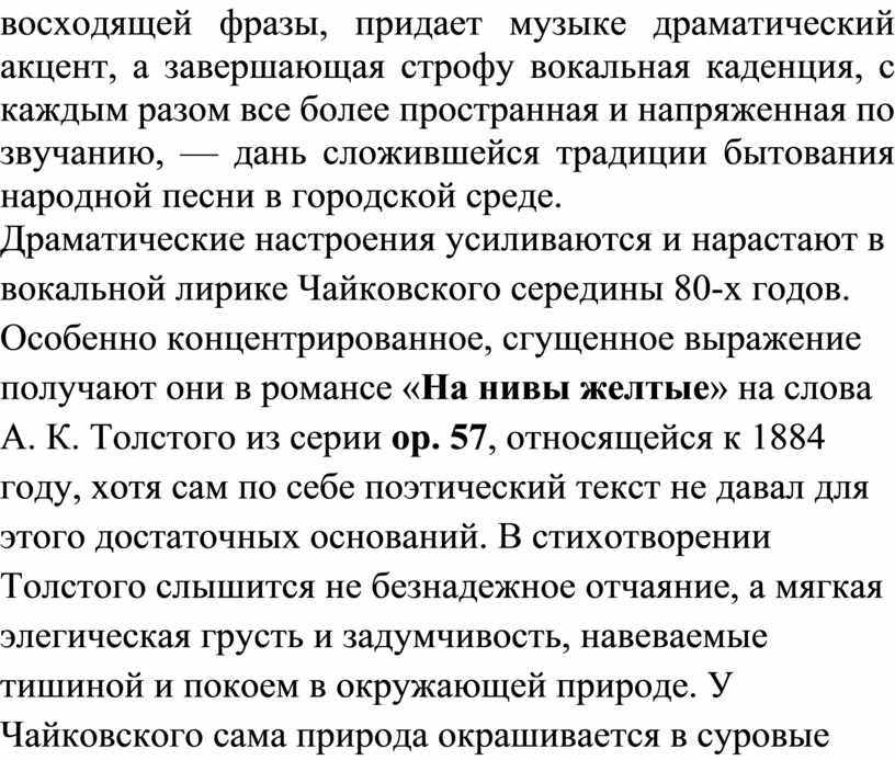 Драматические настроения усиливаются и нарастают в вокальной лирике Чайковского середины 80-х годов. Особенно концентрированное, сгущенное выражение получают они в романсе «На нивы желтые» на слова А. К. Толстого из серии ор. 57, относящейся к 1884 году, хотя сам по себе поэтический текст не давал для этого достаточных оснований. В стихотворении Толстого слышится не безнадежное отчаяние, а мягкая элегическая грусть и задумчивость, навеваемые тишиной и покоем в окружающей природе. У Чайковского сама природа окрашивается в суровые мрачные тона. Во вступительном разделе романса речитативные фразы голоса сопровождаются тяжелыми глухими аккордами фортепиано в низком регистре («дрожа несется звон»), напоминающими уныло однообразные удары похоронного колокола. В среднем разделе вокальная речь приобретает более взволнованный, возбужденный характер, устремляясь к высотной и динамической вершине, но этот бурный порыв так же быстро иссякает и гаснет. Повторение основного построения в конце романса без каких-либо изменений музыкального материала и с теми же словами (У Толстого этого повторения нет.)подчеркивает безысходность страданий и тоски одиночества.