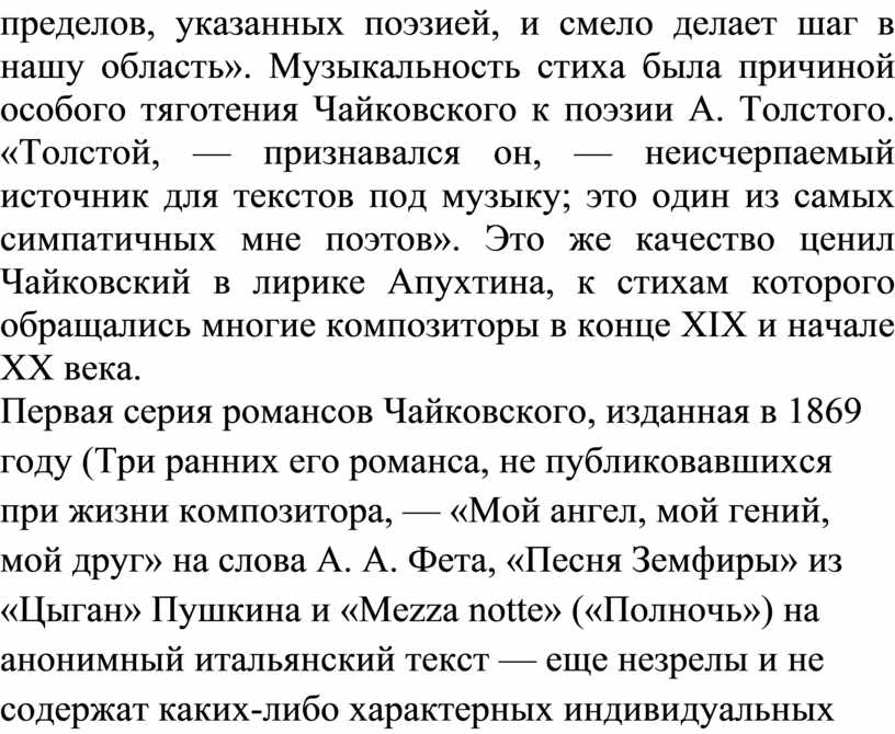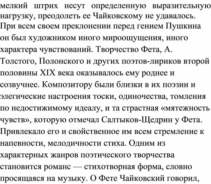 При всем своем преклонении перед гением Пушкина он был художником иного мироощущения, иного характера чувствований. Творчество Фета, А. Толстого, Полонского и других поэтов-лириков второй половины XIX века оказывалось ему роднее и созвучнее. Композитору были близки в их поэзии и элегические настроения тоски, одиночества, томления по недостижимому идеалу, и та страстная «мятежность чувств», которую отмечал Салтыков-Щедрин у Фета. Привлекало его и свойственное им всем стремление к напевности, мелодичности стиха. Одним из характерных жанров поэтического творчества становится романс — стихотворная форма, словно просящаяся на музыку. О Фете Чайковский говорил, что он «не просто поэт, скорее поэт-музыкант», который «в лучшие свои моменты выходит из пределов, указанных поэзией, и смело делает шаг в нашу область». Музыкальность стиха была причиной особого тяготения Чайковского к поэзии А. Толстого. «Толстой, — признавался он, — неисчерпаемый источник для текстов под музыку; это один из самых симпатичных мне поэтов». Это же качество ценил Чайковский в лирике Апухтина, к стихам которого обращались многие композиторы в конце XIX и начале XX века.