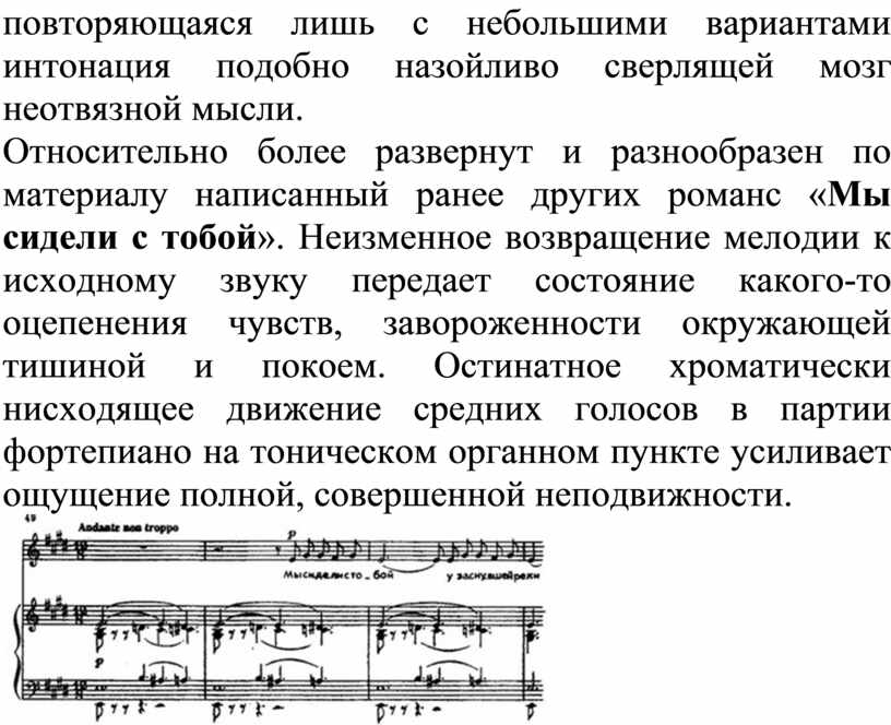 Относительно более развернут и разнообразен по материалу написанный ранее других романс «Мы сидели с тобой». Неизменное возвращение мелодии к исходному звуку передает состояние какого-то оцепенения чувств, завороженности окружающей тишиной и покоем. Остинатное хроматически нисходящее движение средних голосов в партии фортепиано на тоническом органном пункте усиливает ощущение полной, совершенной неподвижности.