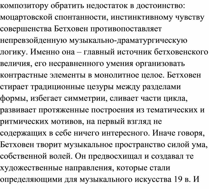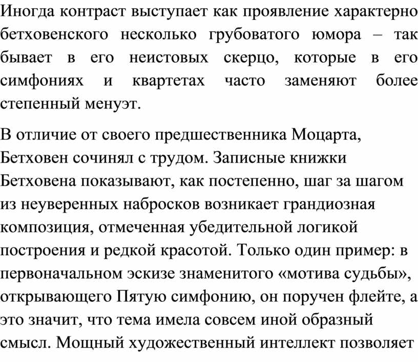 В отличие от своего предшественника Моцарта, Бетховен сочинял с трудом. Записные книжки Бетховена показывают, как постепенно, шаг за шагом из неуверенных набросков возникает грандиозная композиция, отмеченная убедительной логикой построения и редкой красотой. Только один пример: в первоначальном эскизе знаменитого «мотива судьбы», открывающего Пятую симфонию, он поручен флейте, а это значит, что тема имела совсем иной образный смысл. Мощный художественный интеллект позволяет композитору обратить недостаток в достоинство: моцартовской спонтанности, инстинктивному чувству совершенства Бетховен противопоставляет непревзойденную музыкально-драматургическую логику. Именно она – главный источник бетховенского величия, его несравненного умения организовать контрастные элементы в монолитное целое. Бетховен стирает традиционные цезуры между разделами формы, избегает симметрии, сливает части цикла, развивает протяженные построения из тематических и ритмических мотивов, на первый взгляд не содержащих в себе ничего интересного. Иначе говоря, Бетховен творит музыкальное пространство силой ума, собственной волей. Он предвосхищал и создавал те художественные направления, которые стали определяющими для музыкального искусства 19 в. И сегодня его произведения входят в число величайших, наиболее почитаемых творений человеческого гения.