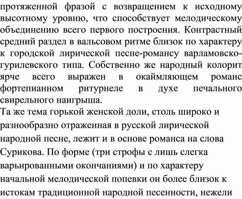 Та же тема горькой женской доли, столь широко и разнообразно отраженная в русской лирической народной песне, лежит и в основе романса на слова Сурикова. По форме (три строфы с лишь слегка варьированными окончаниями) и по характеру начальной мелодической попевки он более близок к истокам традиционной народной песенности, нежели предыдущий, но вторая половина строфы, построенной на секвенционном повторении ярко экспрессивной восходящей фразы, придает музыке драматический акцент, а завершающая строфу вокальная каденция, с каждым разом все более пространная и напряженная по звучанию, — дань сложившейся традиции бытования народной песни в городской среде.