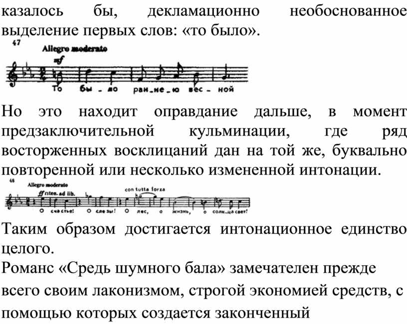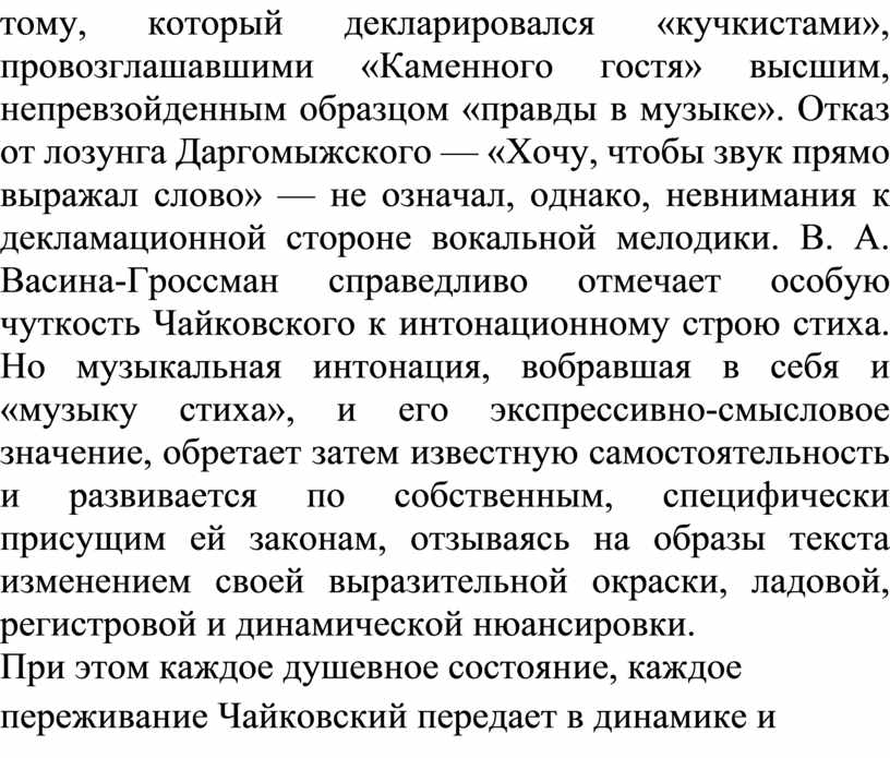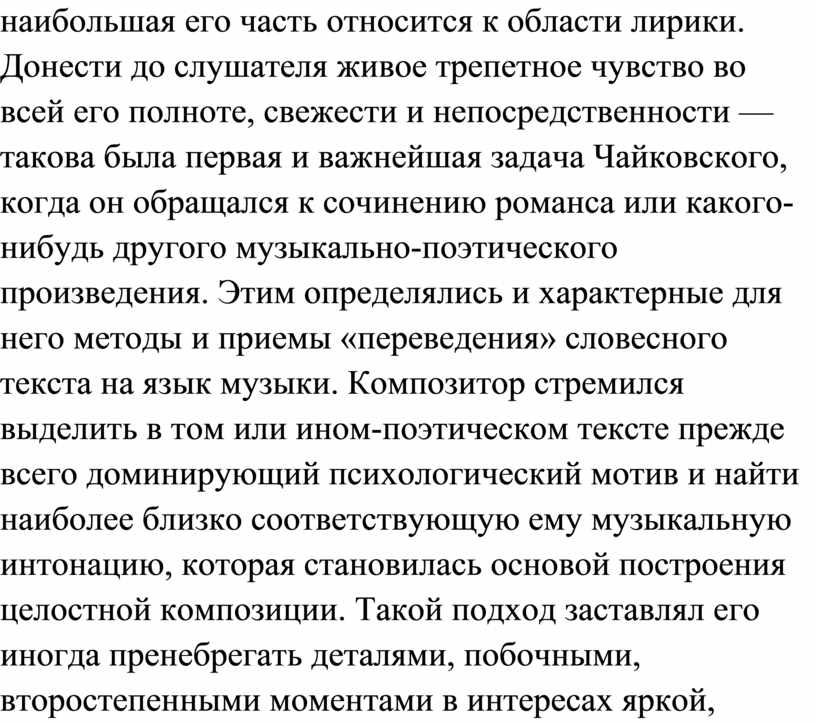 При всем тематическом и жанровом разнообразии вокального творчества Чайковского основная и наибольшая его часть относится к области лирики. Донести до слушателя живое трепетное чувство во всей его полноте, свежести и непосредственности — такова была первая и важнейшая задача Чайковского, когда он обращался к сочинению романса или какого-нибудь другого музыкально-поэтического произведения. Этим определялись и характерные для него методы и приемы «переведения» словесного текста на язык музыки. Композитор стремился выделить в том или ином-поэтическом тексте прежде всего доминирующий психологический мотив и найти наиболее близко соответствующую ему музыкальную интонацию, которая становилась основой построения целостной композиции. Такой подход заставлял его иногда пренебрегать деталями, побочными, второстепенными моментами в интересах яркой, впечатляющей передачи основного настроения. В этом отношении путь его был во многом противоположен тому, который декларировался «кучкистами», провозглашавшими «Каменного гостя» высшим, непревзойденным образцом «правды в музыке». Отказ от лозунга Даргомыжского — «Хочу, чтобы звук прямо выражал слово» — не означал, однако, невнимания к декламационной стороне вокальной мелодики. В. А. Васина-Гроссман справедливо отмечает особую чуткость Чайковского к интонационному строю стиха. Но музыкальная интонация, вобравшая в себя и «музыку стиха», и его экспрессивно-смысловое значение, обретает затем известную самостоятельность и развивается по собственным, специфически присущим ей законам, отзываясь на образы текста изменением своей выразительной окраски, ладовой, регистровой и динамической нюансировки.