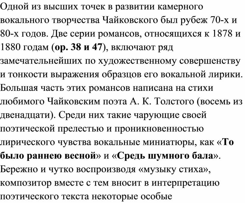 Одной из высших точек в развитии камерного вокального творчества Чайковского был рубеж 70-х и 80-х годов. Две серии романсов, относящихся к 1878 и 1880 годам (ор. 38 и 47), включают ряд замечательнейших по художественному совершенству и тонкости выражения образцов его вокальной лирики. Большая часть этих романсов написана на стихи любимого Чайковским поэта А. К. Толстого (восемь из двенадцати). Среди них такие чарующие своей поэтической прелестью и проникновенностью лирического чувства вокальные миниатюры, как «То было раннею весной» и «Средь шумного бала». Бережно и чутко воспроизводя «музыку стиха», композитор вместе с тем вносит в интерпретацию поэтического текста некоторые особые индивидуальные акценты. Так, в первой фразе романса «То было раннею весной» обращает на себя внимание, казалось бы, декламационно необоснованное выделение первых слов: «то было».