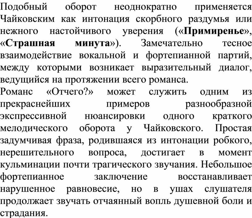 Романс «Отчего?» может служить одним из прекраснейших примеров разнообразной экспрессивной нюансировки одного краткого мелодического оборота у Чайковского. Простая задумчивая фраза, родившаяся из интонации робкого, нерешительного вопроса, достигает в момент кульминации почти трагического звучания. Небольшое фортепианное заключение восстанавливает нарушенное равновесие, но в ушах слушателя продолжает звучать отчаянный вопль душевной боли и страдания.