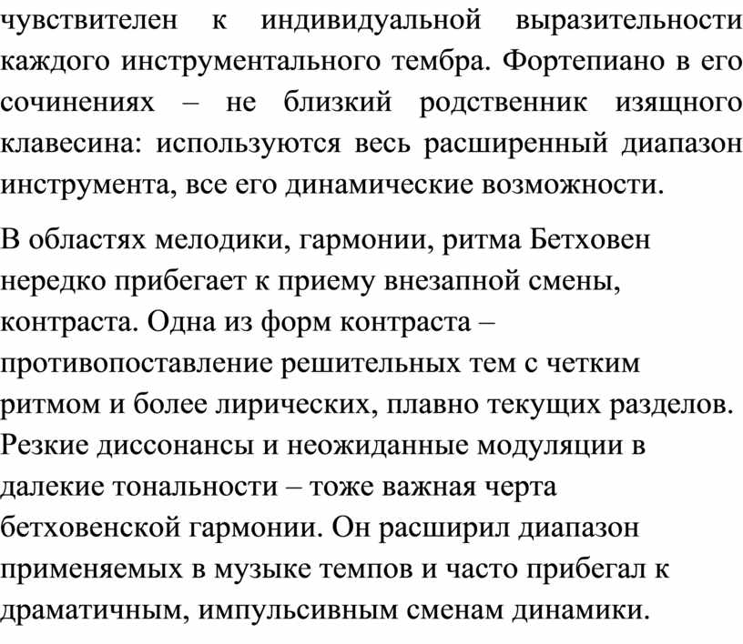 В областях мелодики, гармонии, ритма Бетховен нередко прибегает к приему внезапной смены, контраста. Одна из форм контраста – противопоставление решительных тем с четким ритмом и более лирических, плавно текущих разделов. Резкие диссонансы и неожиданные модуляции в далекие тональности – тоже важная черта бетховенской гармонии. Он расширил диапазон применяемых в музыке темпов и часто прибегал к драматичным, импульсивным сменам динамики. Иногда контраст выступает как проявление характерно бетховенского несколько грубоватого юмора – так бывает в его неистовых скерцо, которые в его симфониях и квартетах часто заменяют более степенный менуэт.