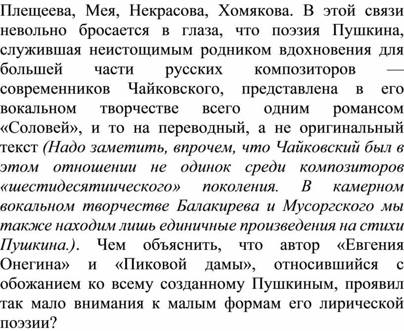 Круг поэтов, к которым обращался Чайковский в своем вокальном творчестве, широк и разнообразен. Среди них встречаются порой случайные, мало известные имена: какой-нибудь один мотив, удачный яркий образ или общий эмоциональный настрой мог привлечь внимание композитора к стихотворению, в целом не обладающему значительными поэтическими достоинствами. Но такие примеры сравнительно немногочисленны, основная же часть романсов Чайковского написана на высокохудожественные тексты, принадлежащие перу выдающихся русских поэтов XIX века. В их числе мы находим имена А. Толстого, Майкова, Тютчева, Фета, Полонского, Плещеева, Мея, Некрасова, Хомякова. В этой связи невольно бросается в глаза, что поэзия Пушкина, служившая неистощимым родником вдохновения для большей части русских композиторов — современников Чайковского, представлена в его вокальном творчестве всего одним романсом «Соловей», и то на переводный, а не оригинальный текст (Надо заметить, впрочем, что Чайковский был в этом отношении не одинок среди композиторов «шестидесятиического» поколения. В камерном вокальном творчестве Балакирева и Мусоргского мы также находим лишь единичные произведения на стихи Пушкина.). Чем объяснить, что автор «Евгения Онегина» и «Пиковой дамы», относившийся с обожанием ко всему созданному Пушкиным, проявил так мало внимания к малым формам его лирической поэзии?