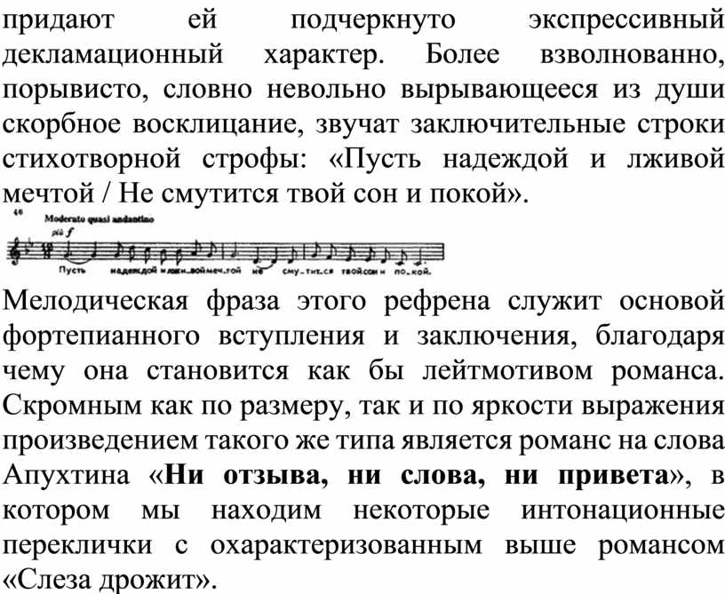 Мелодическая фраза этого рефрена служит основой фортепианного вступления и заключения, благодаря чему она становится как бы лейтмотивом романса. Скромным как по размеру, так и по яркости выражения произведением такого же типа является романс на слова Апухтина «Ни отзыва, ни слова, ни привета», в котором мы находим некоторые интонационные переклички с охарактеризованным выше романсом «Слеза дрожит».