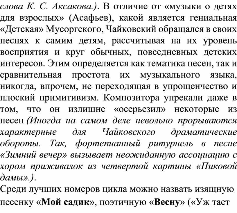 Суждение Лароша остается, в общем, верным и по отношению к фортепианному творчеству Чайковского в целом. Чайковский не был «фортепианно мыслящим» композитором: с чисто пианистической точки зрения его сочинения для фортепиано часто недостаточно выигрышны и не очень удобны для исполнения. Но они привлекают свежестью, образностью музыки, простотой и непосредственностью выражения. Чайковскому принадлежит более ста пьес для фортепиано различного объема и типа, пользовавшихся широкой популярностью у современников. Многие из этих пьес заняли прочное место и на концертной эстраде, и в повседневном быту, став неотъемлемым достоянием домашнего музицирования. Не отличаясь особой утонченностью пианистической фактуры и оригинальностью приемов изложения, они привлекали своим выразительным мелодизмом и яркой образностью музыки, связанной с родными и близкими сердцу композитора картинами русской городской и усадебной жизни.