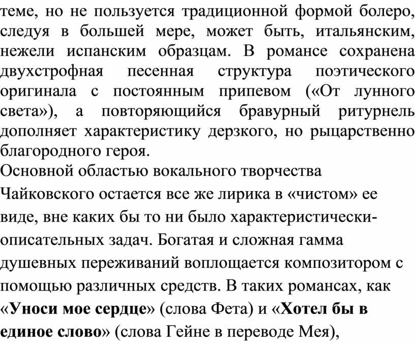 Основной областью вокального творчества Чайковского остается все же лирика в «чистом» ее виде, вне каких бы то ни было характеристически-описательных задач. Богатая и сложная гамма душевных переживаний воплощается композитором с помощью различных средств. В таких романсах, как «Уноси мое сердце» (слова Фета) и «Хотел бы в единое слово» (слова Гейне в переводе Мея), проникнутых единым страстным порывом, он больше заботится о целостности и законченности волнообразно развивающейся мелодической линии, чем о декламационном заострении отдельных фраз. Оба романса очень сходны не только по общей эмоциональной окраске, но и по форме изложения: легко взлетающий парящий мелодический рисунок вокальной партии, ровность и непрерывность ритмической пульсации в рамках шестидольного размера, соответствующего двум стопам стихотворного текста (В первом случае анапестической, во втором — амфибрахической.).