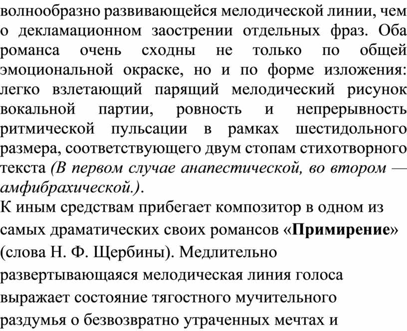 К иным средствам прибегает композитор в одном из самых драматических своих романсов «Примирение» (слова Н. Ф. Щербины). Медлительно развертывающаяся мелодическая линия голоса выражает состояние тягостного мучительного раздумья о безвозвратно утраченных мечтах и надеждах. Насыщенность мелодии интервалами большой и малой септимы, увеличенной кварты придают ей подчеркнуто экспрессивный декламационный характер. Более взволнованно, порывисто, словно невольно вырывающееся из души скорбное восклицание, звучат заключительные строки стихотворной строфы: «Пусть надеждой и лживой мечтой / Не смутится твой сон и покой».