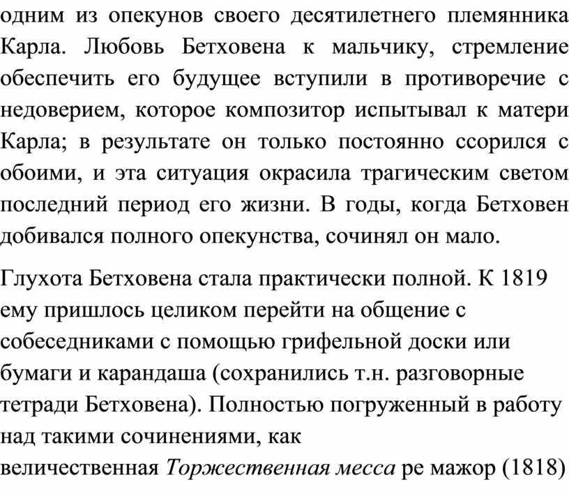 Материальное положение композитора заметно улучшилось. Издатели охотились за его партитурами и заказывали такие, например, сочинения, как большие фортепианные вариации на тему вальса Диабелли (1823). Его заботливые друзья, особенно глубоко преданный Бетховену А.Шиндлер, наблюдая беспорядочный и полный лишений образ жизни музыканта и слыша его жалобы на то, что его «обобрали» (Бетховен стал беспричинно подозрительным и был готов обвинить в самом худшем почти всех лиц из своего окружения), не могли понять, куда он девает деньги. Они не знали, что композитор откладывает их, но делает это не для себя. Когда в 1815 умер его брат Каспар, композитор стал одним из опекунов своего десятилетнего племянника Карла. Любовь Бетховена к мальчику, стремление обеспечить его будущее вступили в противоречие с недоверием, которое композитор испытывал к матери Карла; в результате он только постоянно ссорился с обоими, и эта ситуация окрасила трагическим светом последний период его жизни. В годы, когда Бетховен добивался полного опекунства, сочинял он мало.