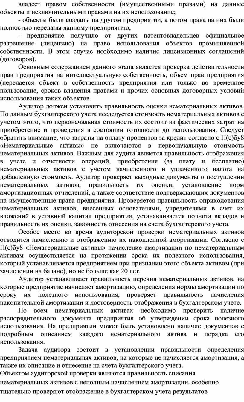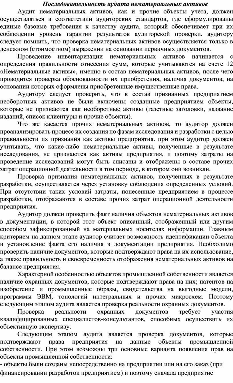 Что же касается прочих нематериальных активов, то аудитор должен проанализировать процесс их создания по фазам исследования и разработки с целью правильности их признания как активы предприятия. при этом аудитор должен учитывать, что какие-либо нематериальные активы, полученные в результате исследования, не признаются как активы предприятия, и поэтому затраты на проведение исследований могут быть списаны и отображены в составе прочих затрат операционной деятельности в том периоде, в котором они возникли.