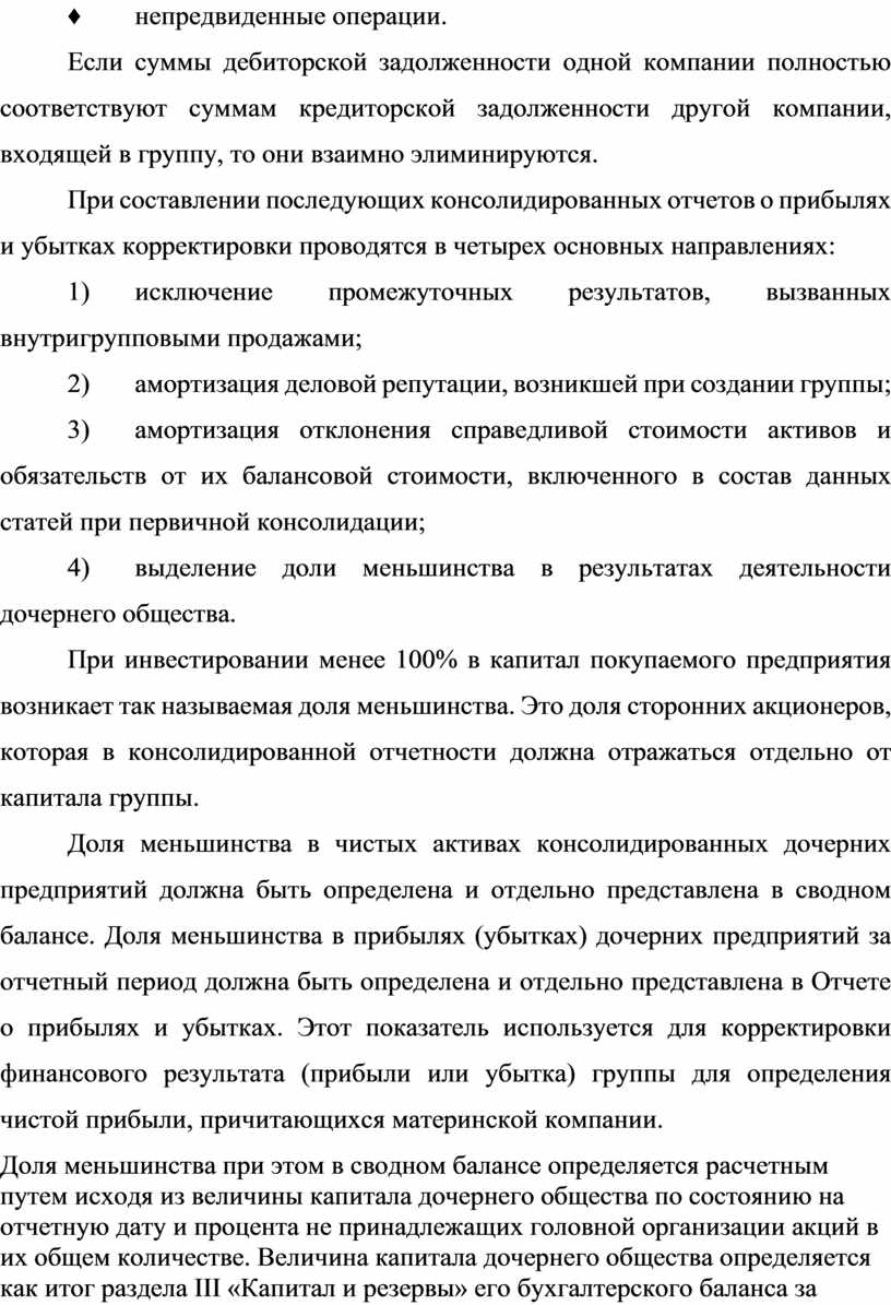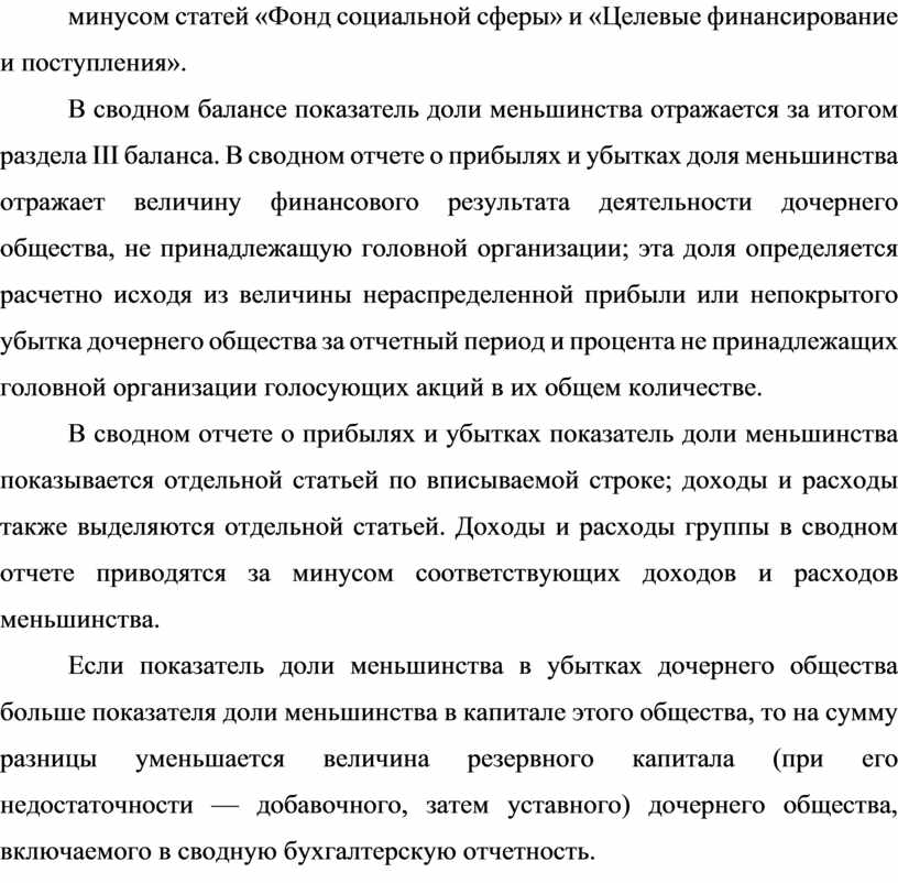 Доля меньшинства при этом в сводном балансе определяется расчетным путем исходя из величины капитала дочернего общества по состоянию на отчетную дату и процента не принадлежащих головной организации акций в их общем количестве. Величина капитала дочернего общества определяется как итог раздела III «Капитал и резервы» его бухгалтерского баланса за минусом статей «Фонд социальной сферы» и «Целевые финансирование и поступления».