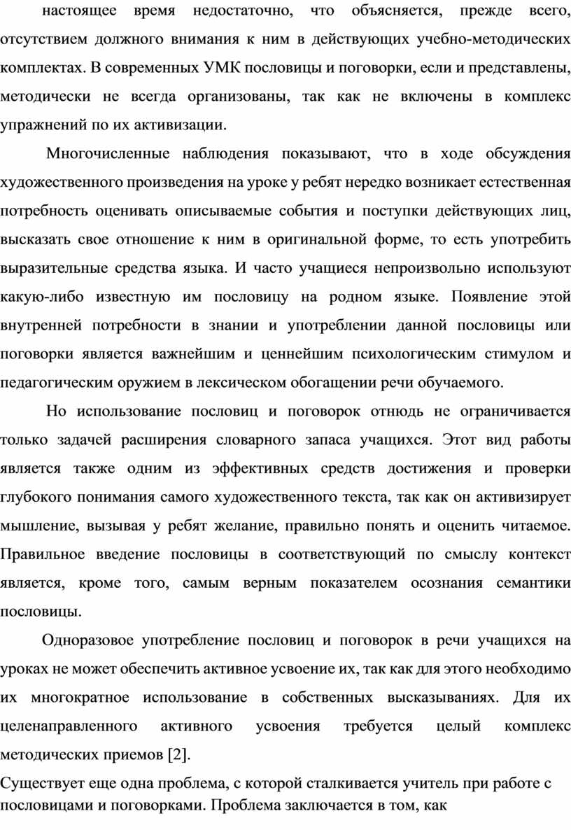 Опыт многих учителей, преподавателей показывает, что пословицы и поговорки являются немаловажным средством повышения эффективности учебно-воспитательного процесса. Между тем, в практике преподавания иностранных языков в средней школе пословицы и поговорки используются в настоящее время недостаточно, что объясняется, прежде всего, отсутствием должного внимания к ним в действующих учебно-методических комплектах. В современных УМК пословицы и поговорки, если и представлены, методически не всегда организованы, так как не включены в комплекс упражнений по их активизации.