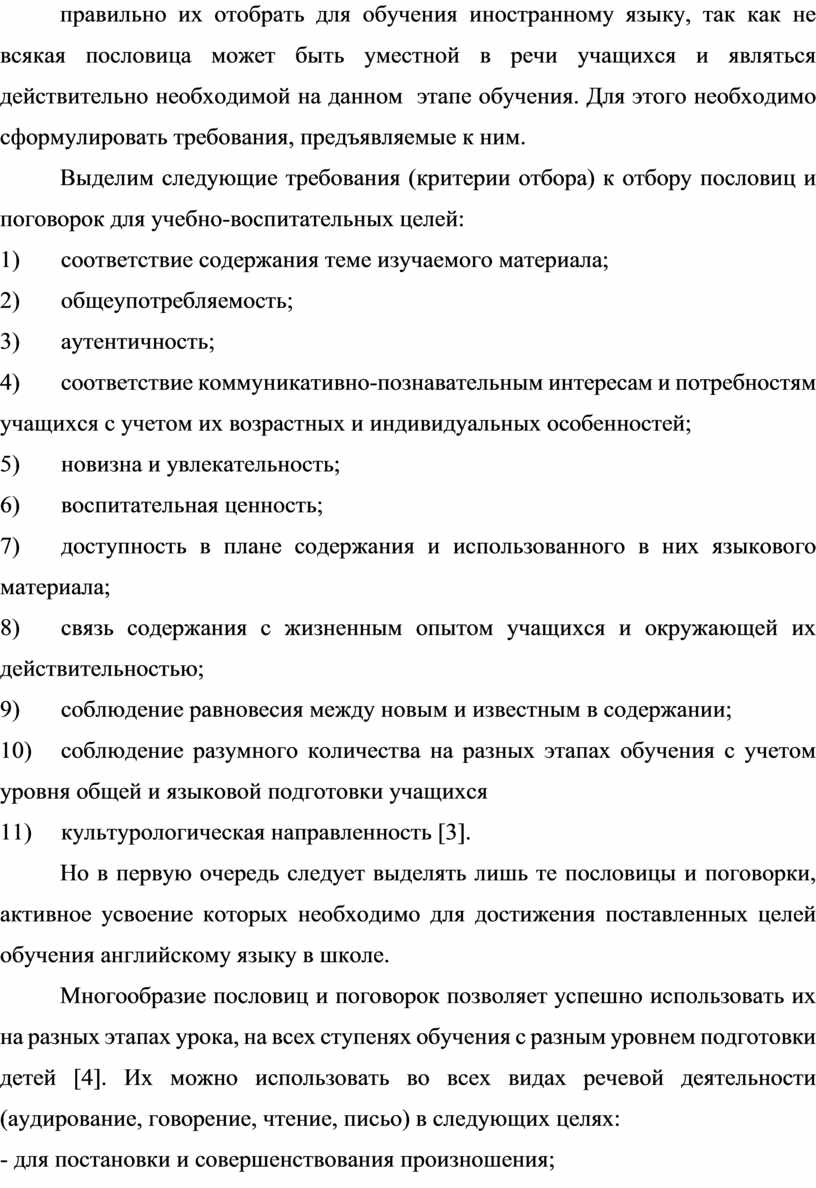 Но в первую очередь следует выделять лишь те пословицы и поговорки, активное усвоение которых необходимо для достижения поставленных целей обучения английскому языку в школе.