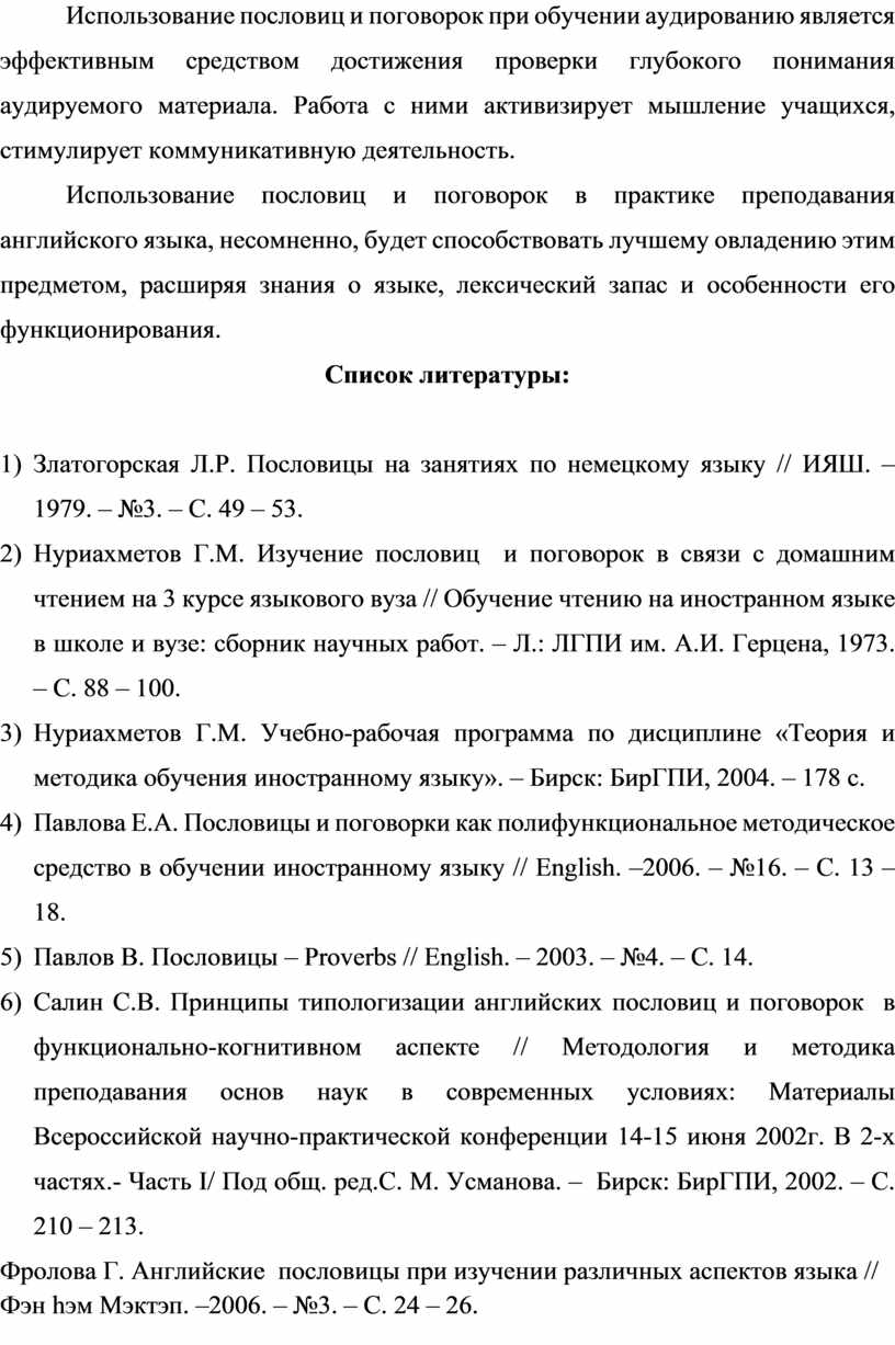 2) Нуриахметов Г.М. Изучение пословиц и поговорок в связи с домашним чтением на 3 курсе языкового вуза // Обучение чтению на иностранном языке в школе и вузе: сборник научных работ. – Л.: ЛГПИ им. А.И. Герцена, 1973. – С. 88 – 100.