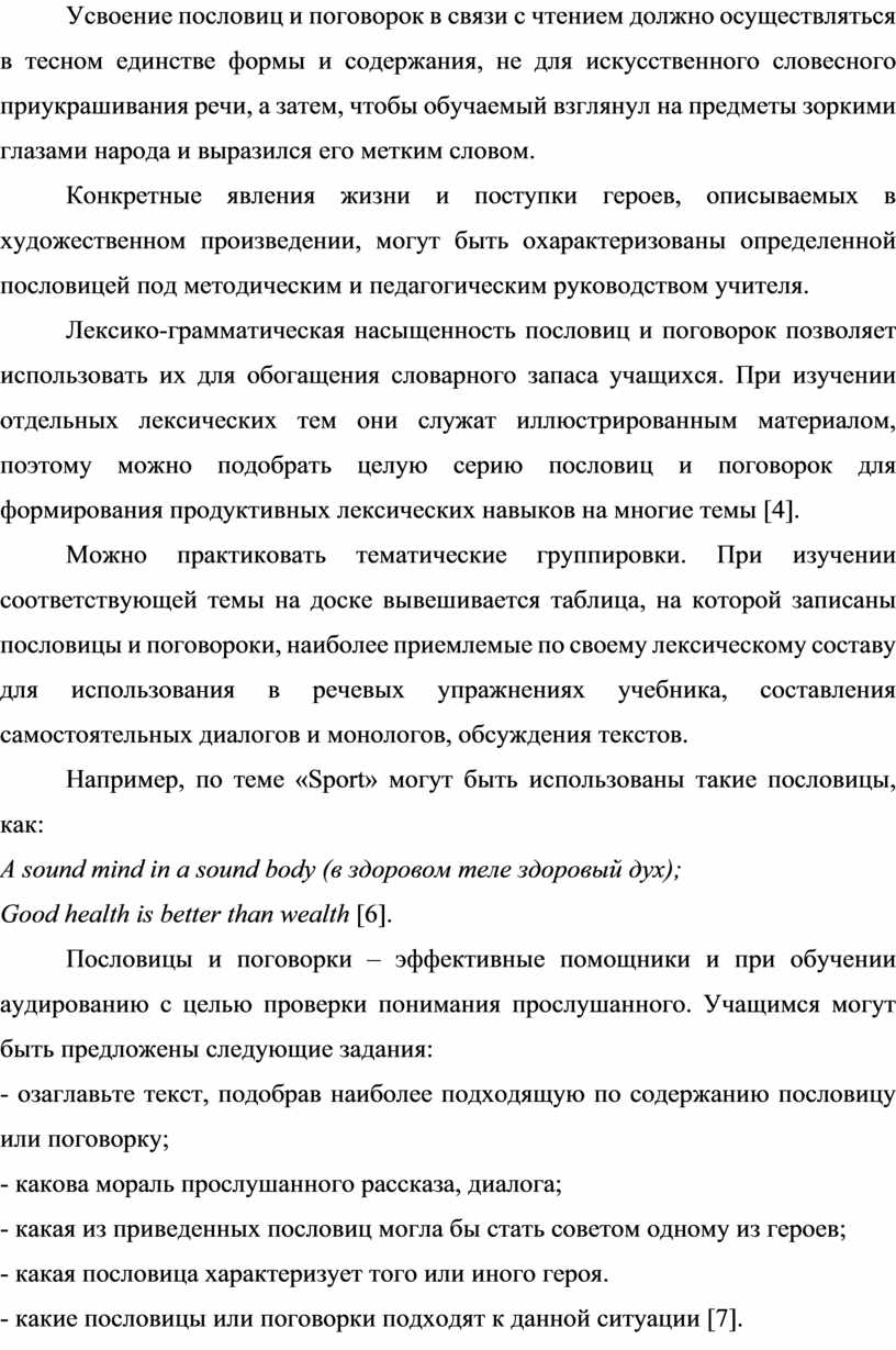 Использование пословиц и поговорок при обучении аудированию является эффективным средством достижения проверки глубокого понимания аудируемого материала. Работа с ними активизирует мышление учащихся, стимулирует коммуникативную деятельность.