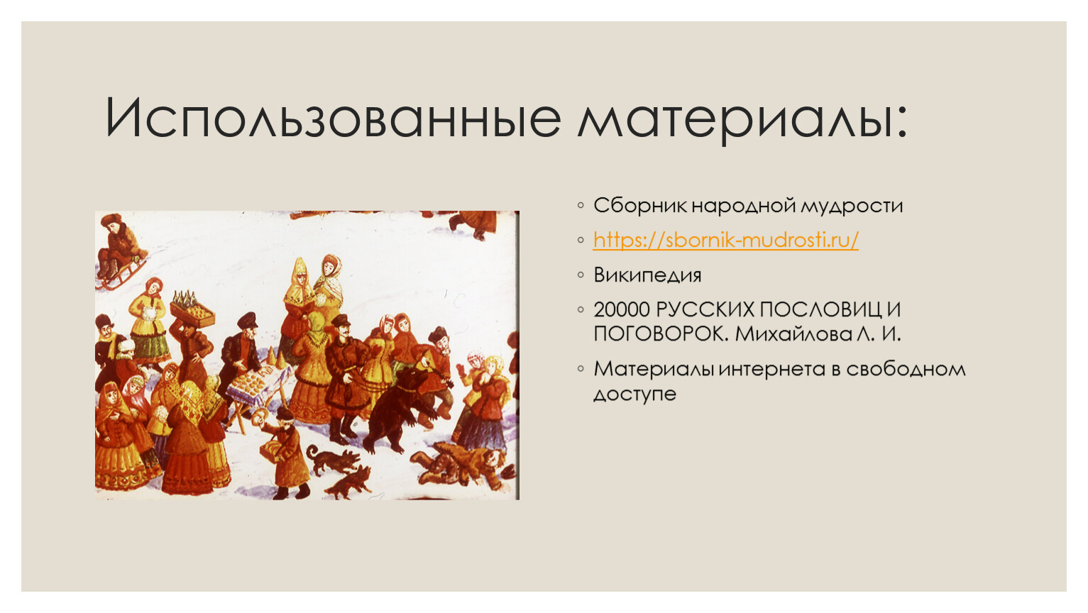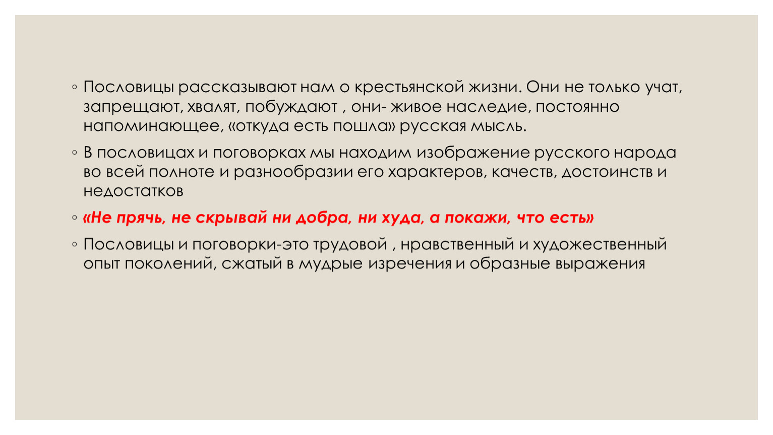 Пословицы рассказывают нам о крестьянской жизни. Они не только учат, запрещают, хвалят, побуждают , они- живое наследие, постоянно напоминающее, «откуда есть пошла» русская мысль.