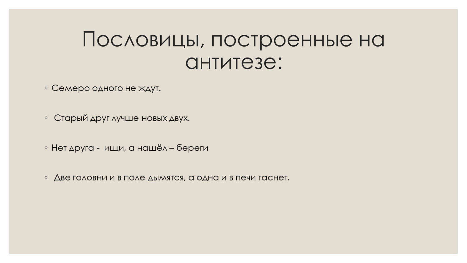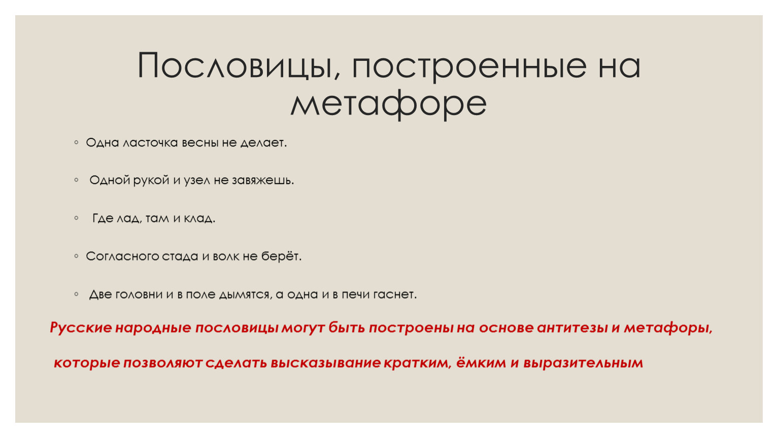 Русские народные пословицы могут быть построены на основе антитезы и метафоры,